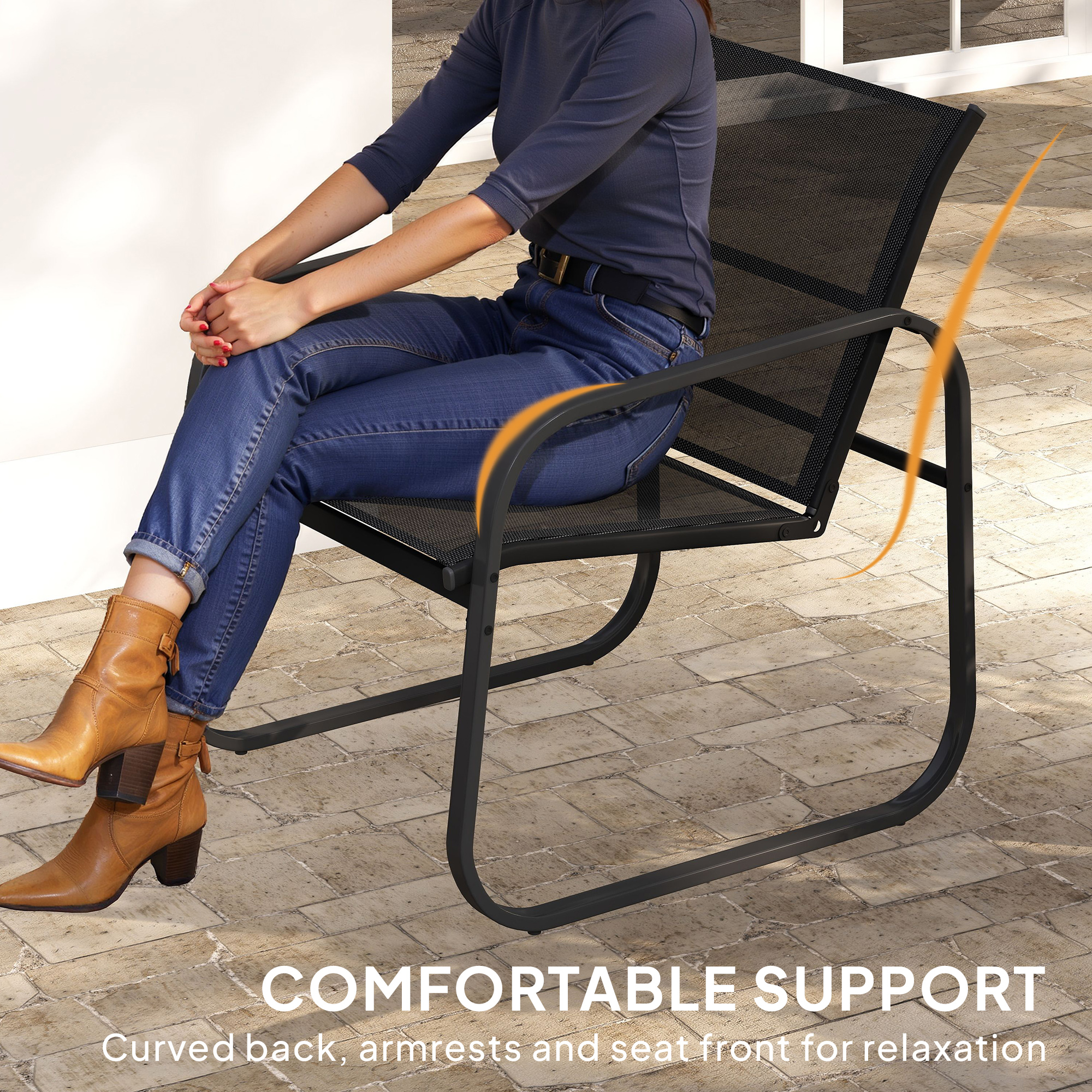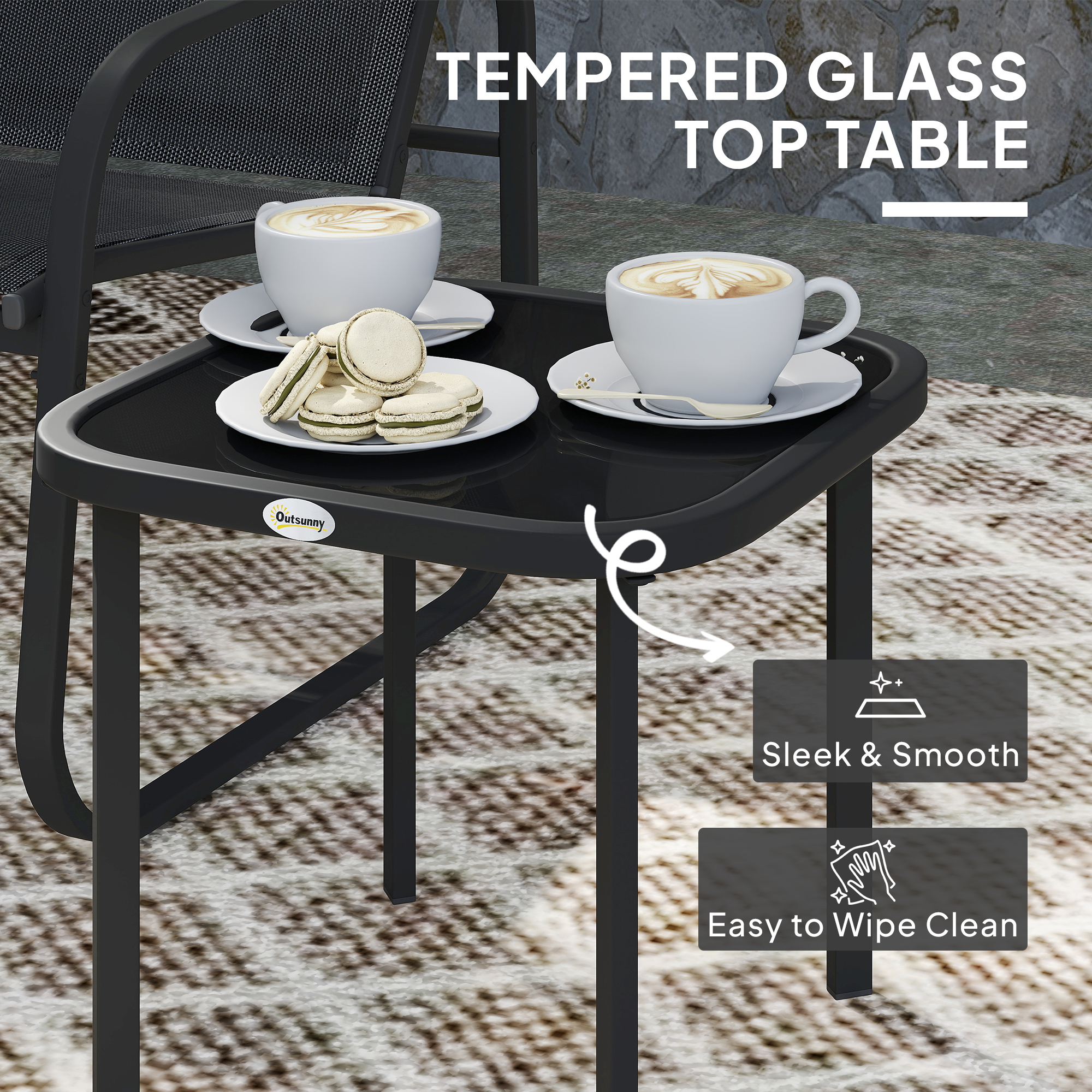 For all outdoor spaces, comes this three-piece garden table and chairs. It comes with two armchairs and a small square glass-top table: sit with company. The conservatory furniture set is made from powder coated steel, so all patio table and chairs are tough and will support you fully. The texteline panels on the seats and backs help to keep you cool; the chairs come with curved back and armrests to support the body.