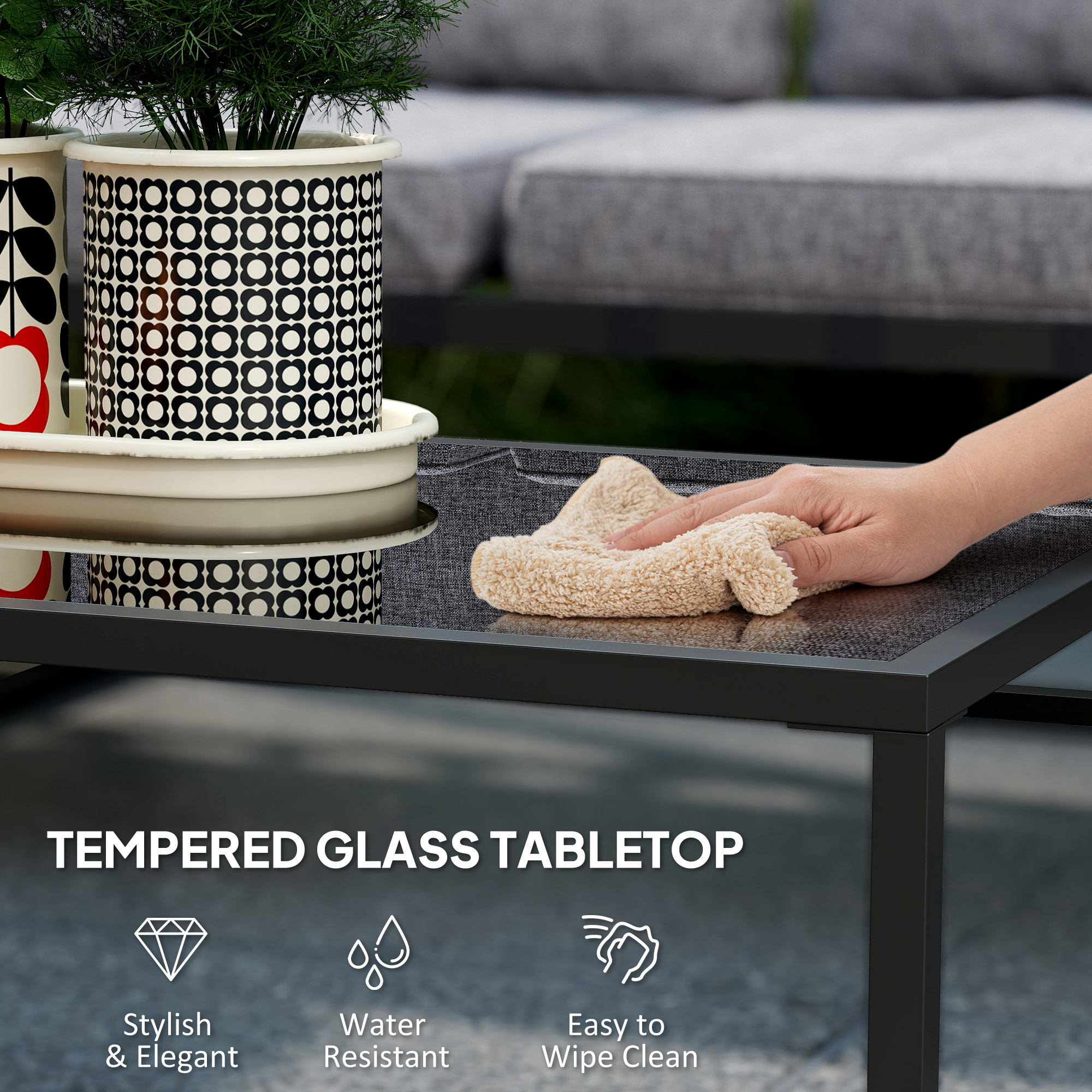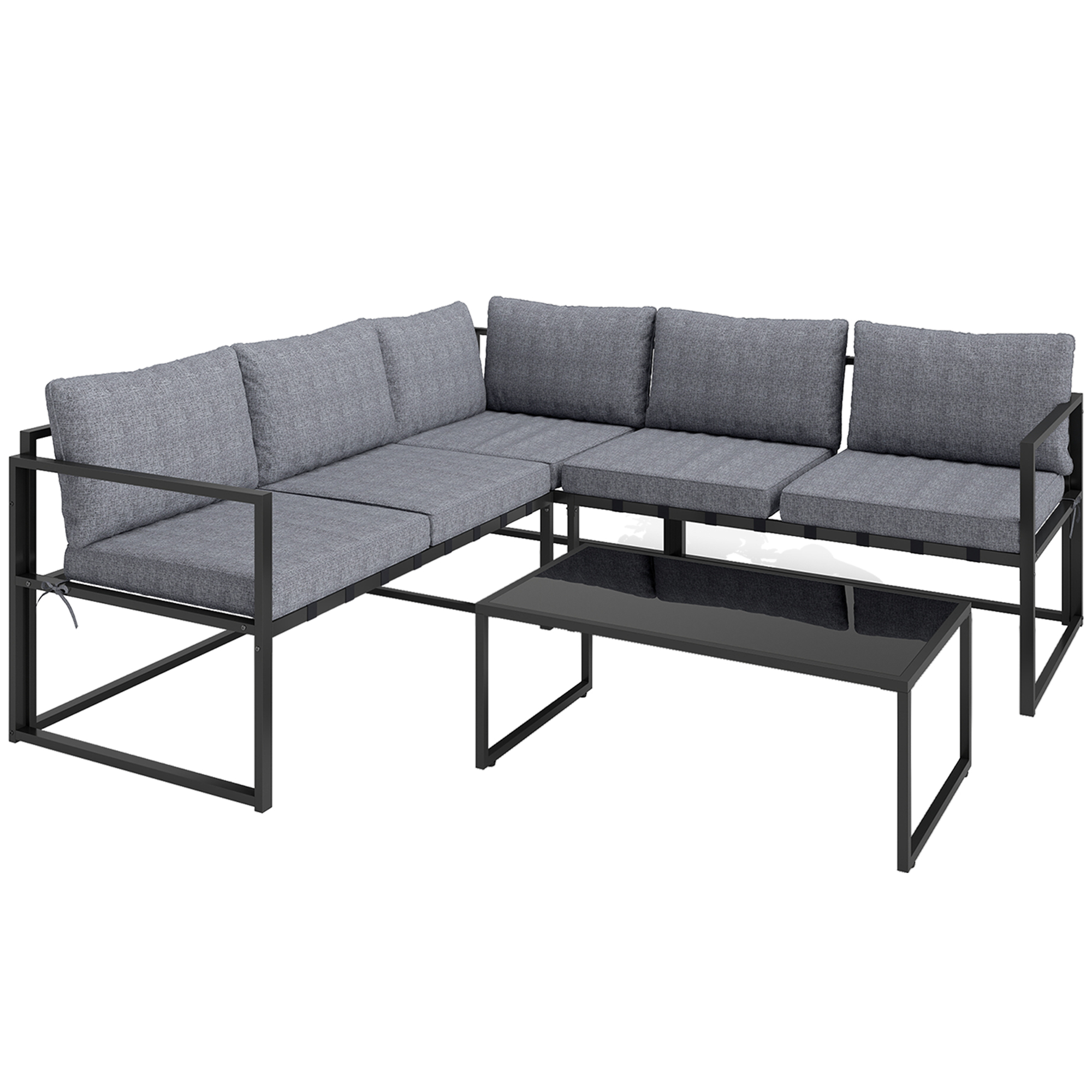 Discover the charm of the corner garden furniture set, a delightful addition to any outdoor space. This three-piece set includes a three-seater sofa, a loveseat and a coffee table, topped with sleek black tempered glass. Enjoy optimal comfort with thick, soft cushions and a robust, weather-resistant steel frame. Great for lounging under the sky or hosting memorable gatherings. Suitable for any garden, balcony, or patio.