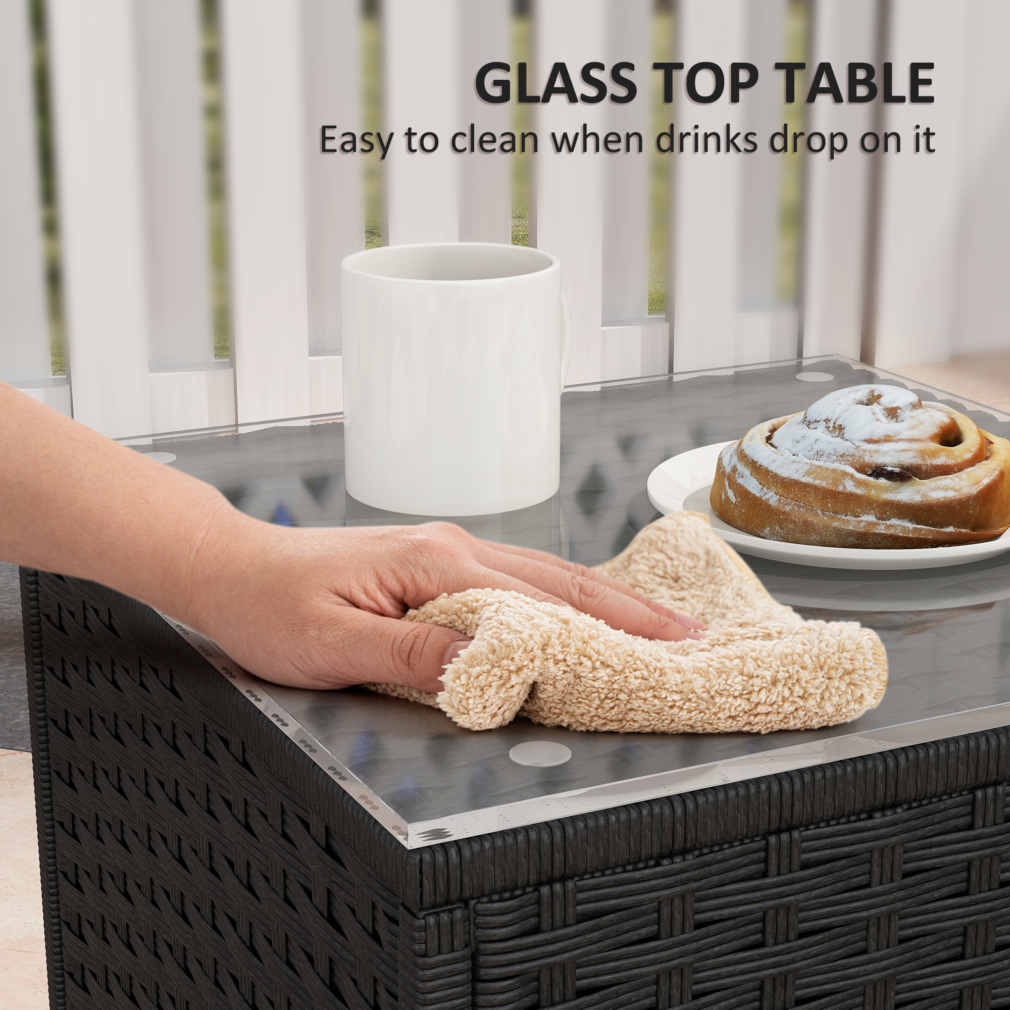 Rock the day away with this three-piece garden bistro set. Comes with two rocking chairs and a matching glass-top table. The powder coated steel frames offer a strong core, wrapped in tough and protective plastic wicker - a stylish rattan design, looks great in your garden. The chairs come with a rocking base, to sway forwards and backwards gently, at your control - a total relaxation balcony table and chairs set!