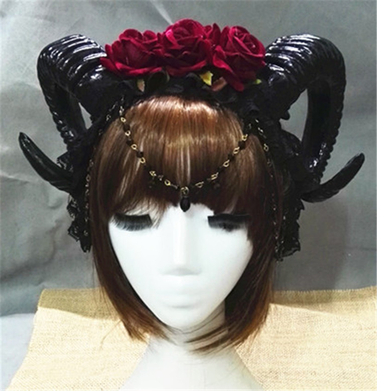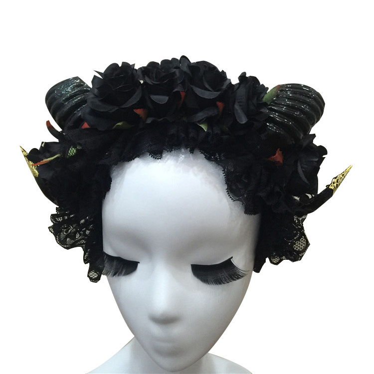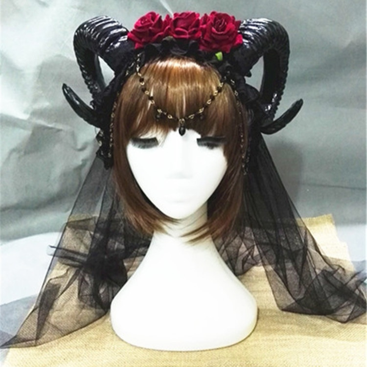 Three Roses Headband Halloween Vampire Demonsheep Horn Veil Hair Accessories