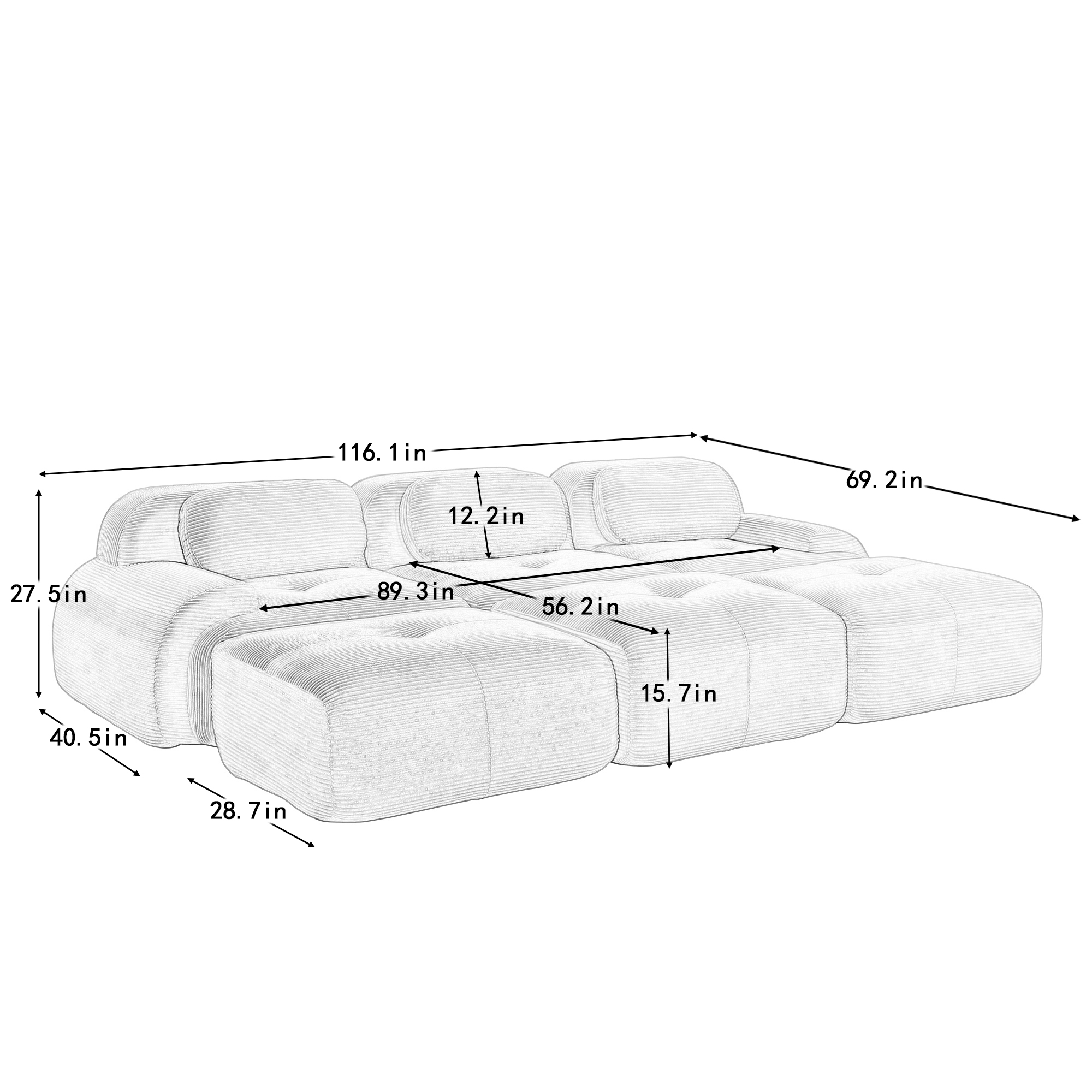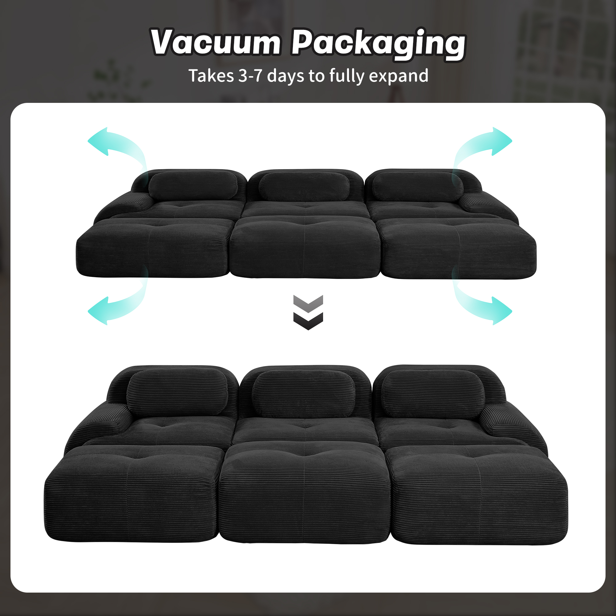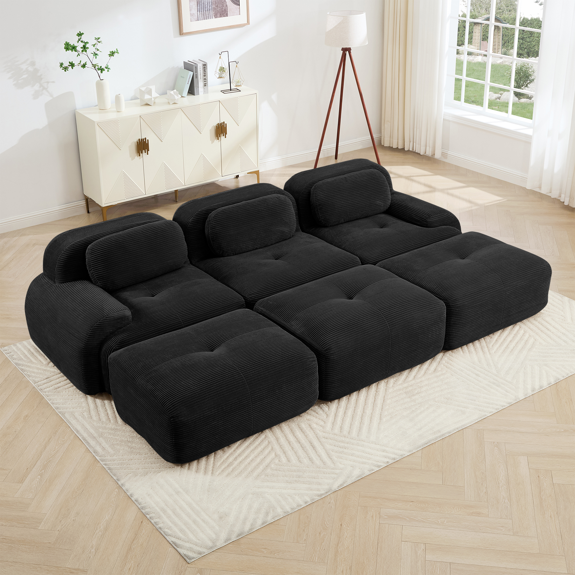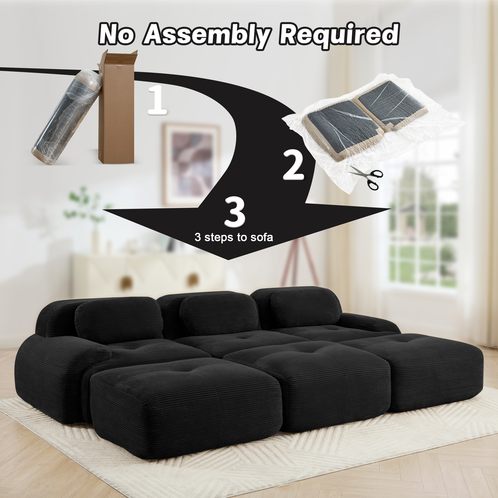 Product Name:Three-seat modular sofa with 3 Ottomans corduroy fabric no assembly pet-friendly ultra-wide curved armrests 32D high-resilience sponge living rooms media rooms,Black