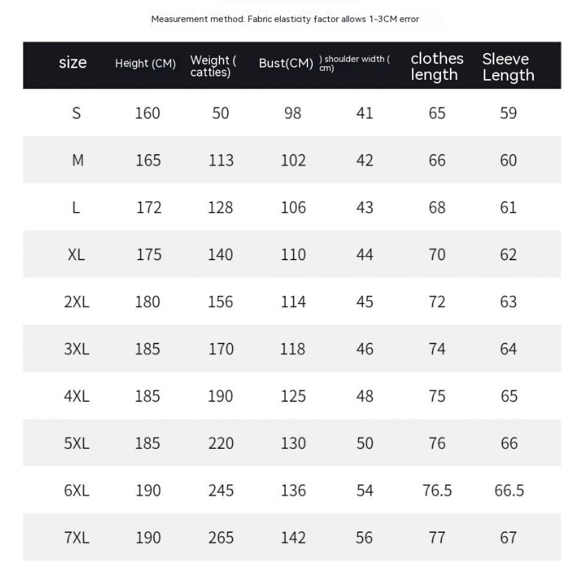 Size: S 40.00kg-50.00kg wearable, M 50.00kg-57.50kg wearable, L 55.00kg-65.00kg wearable, XL 620kg-72.50kg wearable, 2XL 70.00kg-82.50kg wearable, 3XL 82.50kg-92.50kg wearable, 4XL 92.50kg-105.00kg wearable, 5XL 102.50kg-115.00kg wearable, 6XL 115.00kg-125.00kg wearable, 7XL 125.00kg-137.50kg wearable, 8XL 135.00kg-150.00kg wearable