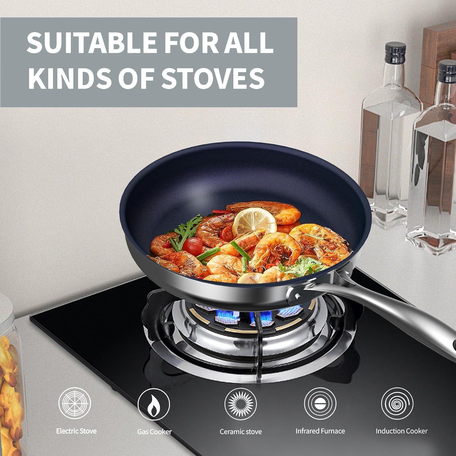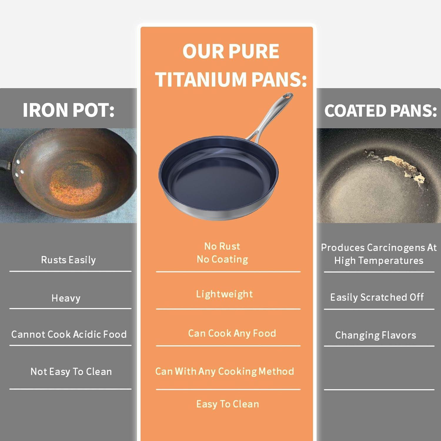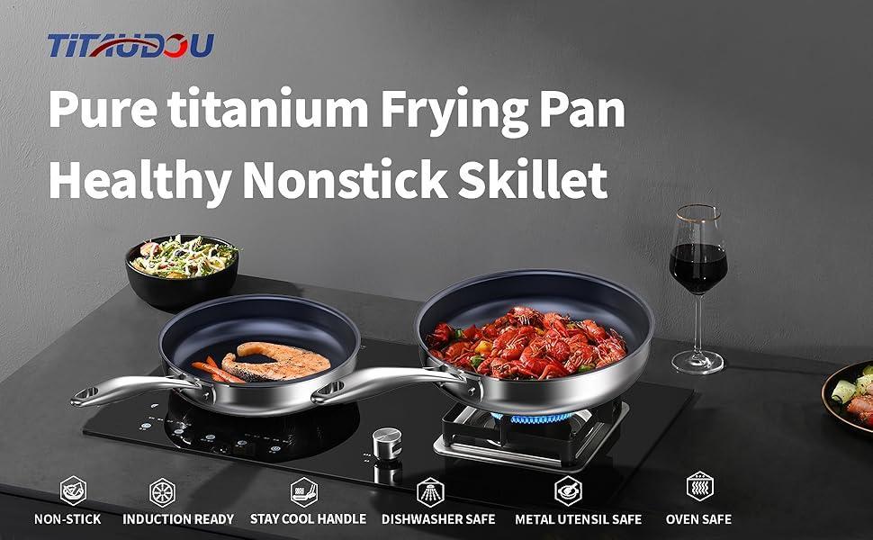 Easy to Clean & Maintenance-Free: The smooth, no-coating nonstick surface of our titanium frying pan simplifies cleanup, allowing you to wipe it down effortlessly or wash it in the dishwasher. Its robust construction resists scratches and wear, ensuring minimal maintenance and a long service life.