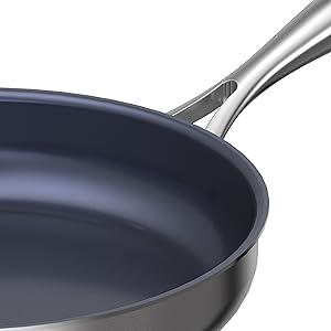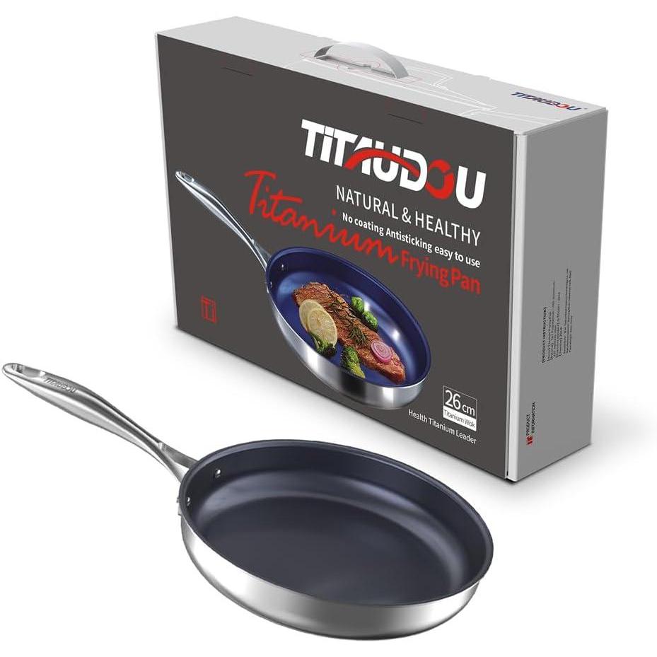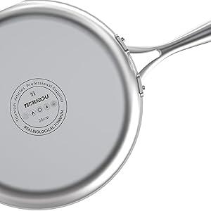 Premium Titanium Material: Crafted from tri-ply construction with titanium & stainless steel, our frying pan guarantees exceptional durability and lightweight performance. Titanium's inherent corrosion resistance ensures a long-lasting cooking surface that retains its shine and functionality over time.