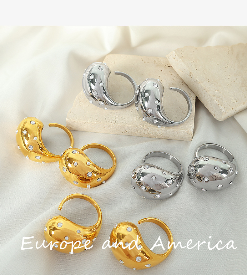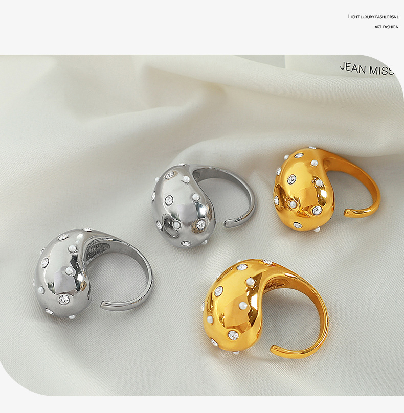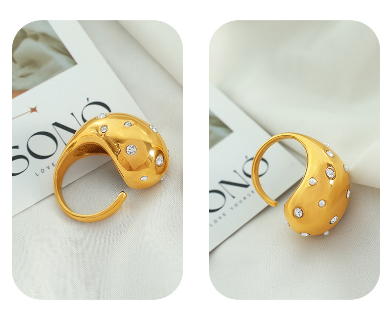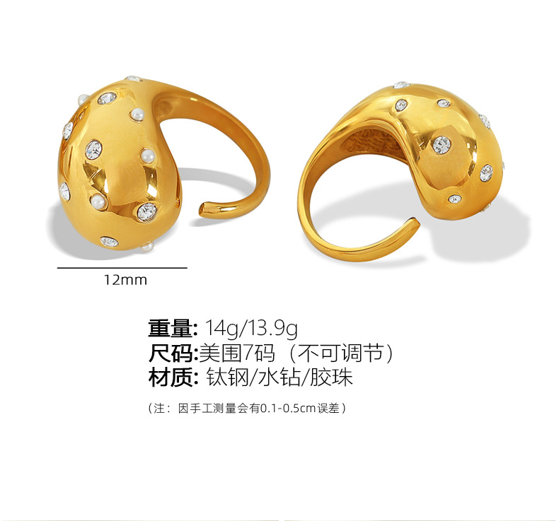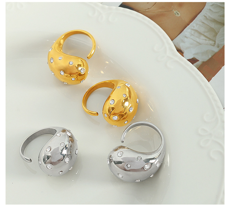 Titanium Steel 18K Gold Plated Ring, Micro-set Zircon & Rubber Bead, Adjustable Waterdrop Ring, Trendy Jewelry