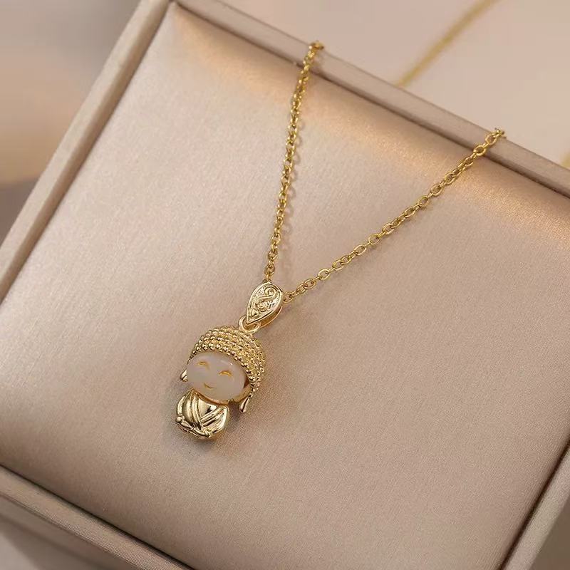 Titanium Steel Gold & Small Cute Buddha Jade Buddha Statue Necklace Lucky Maitreya Buddha Clavicle Chain