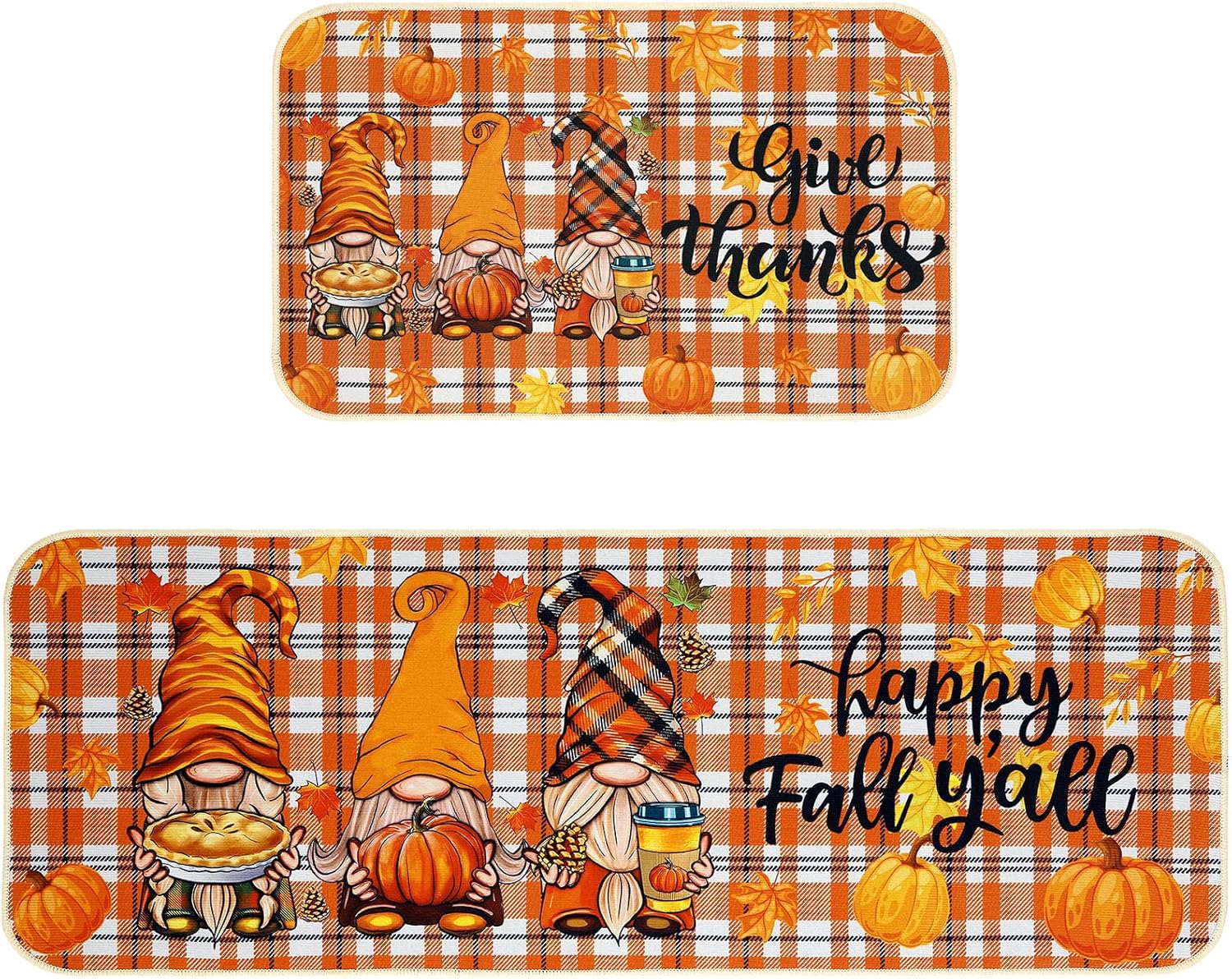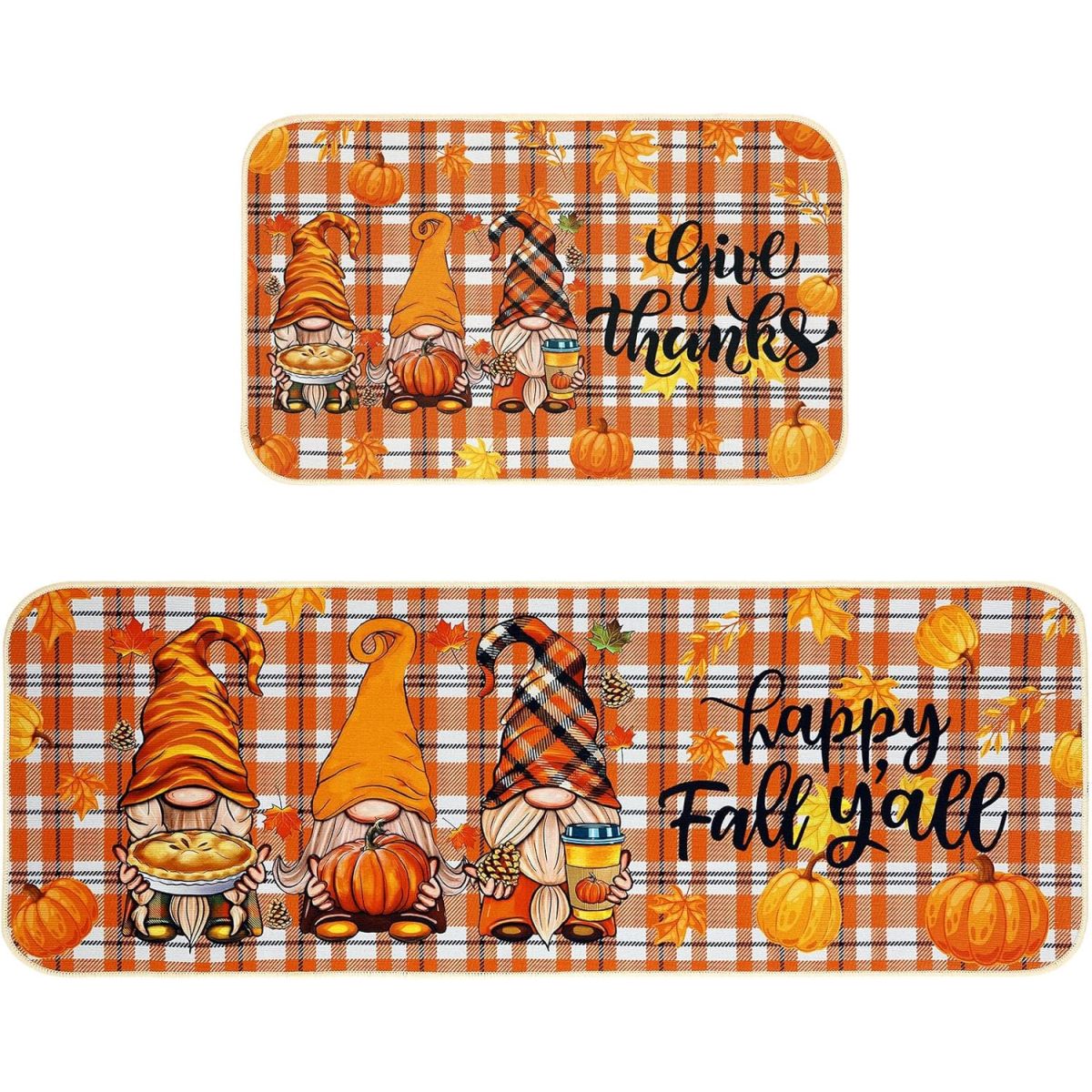 Autumn Theme: Our orange kitchen rug is designed with plaid patterns, and incorporate autumn elements such as maple leaves, pumpkins, pinecones and gnome, as well as slogans such as "Happy Fall Y'all" and give thanks, which add a strong autumn atmosphere to your kitchen and make cooking easier and more enjoyable