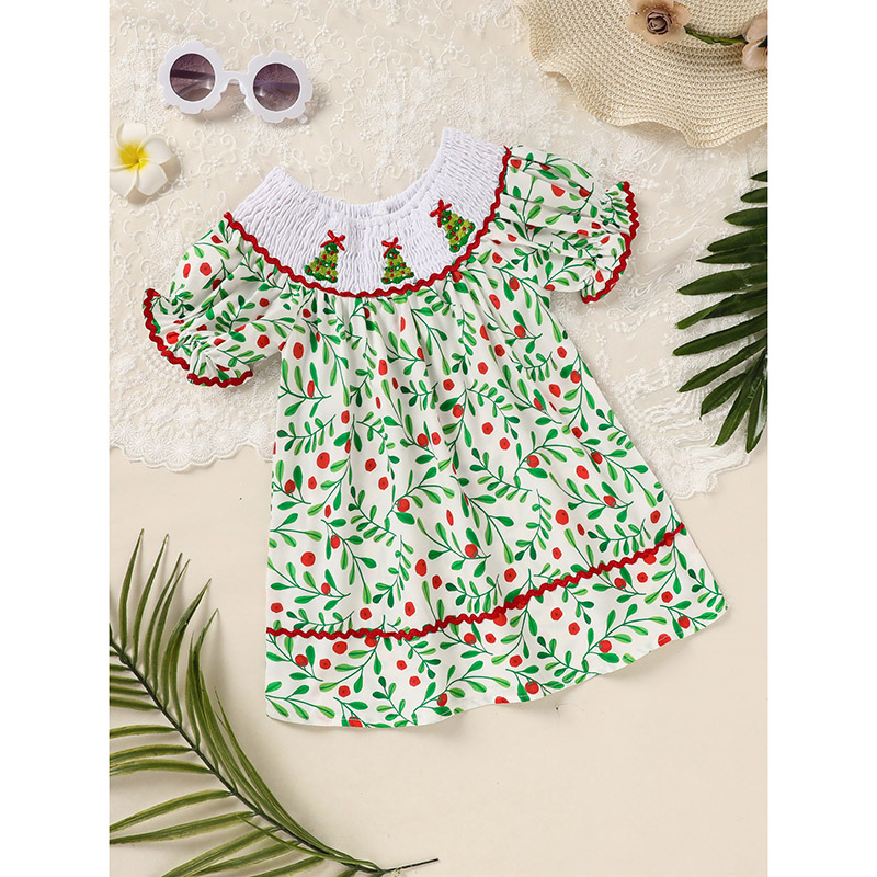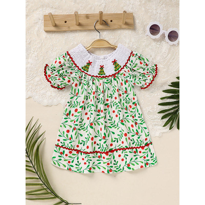Toddler Infant Baby Girls Christmas Dress Short Sleeve Christmas Tree Embroidered Plaid Casual Party Dresses