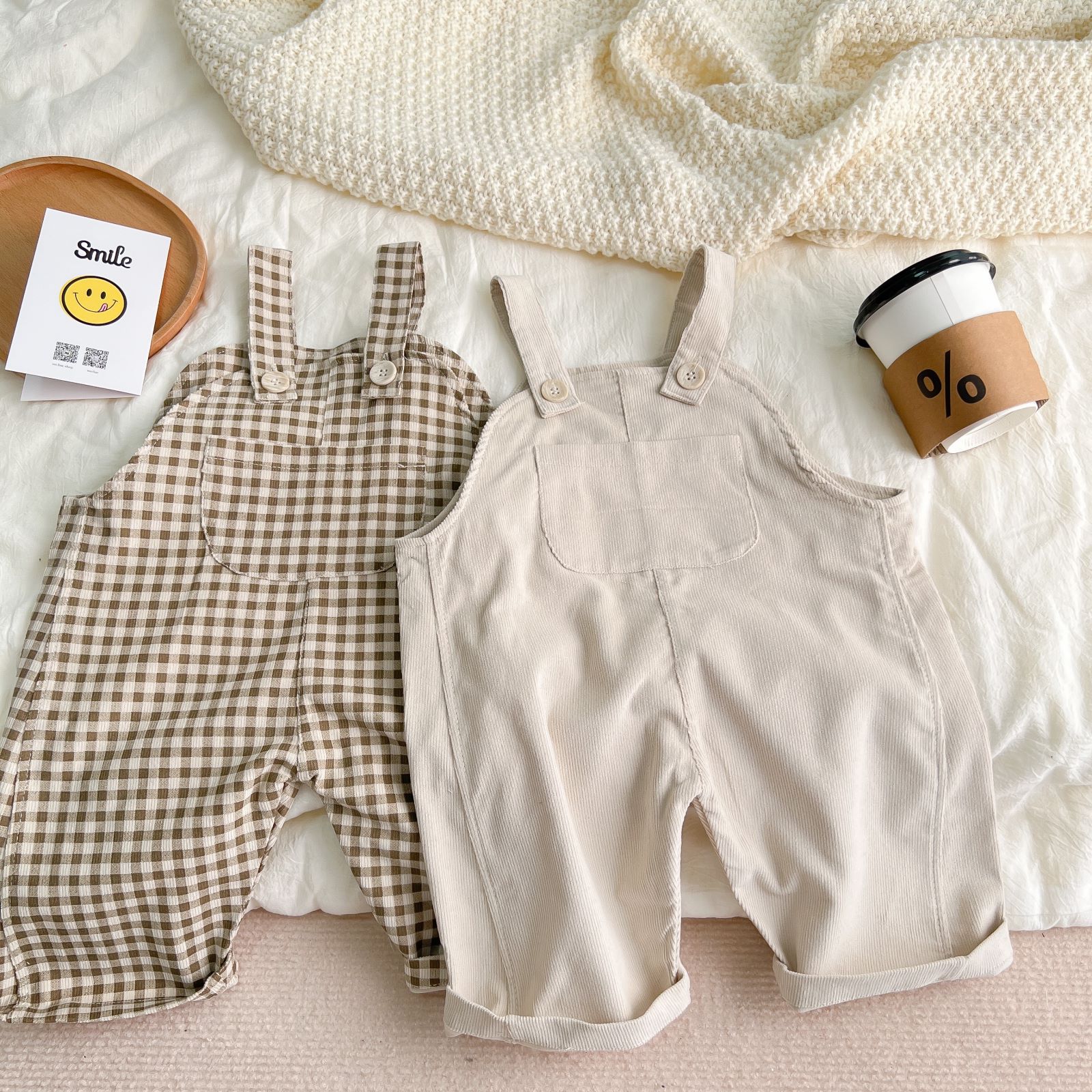 Color: Beige Corduroy Big Pocket Overalls, Brown Plaid Corduroy Big Pocket Overalls