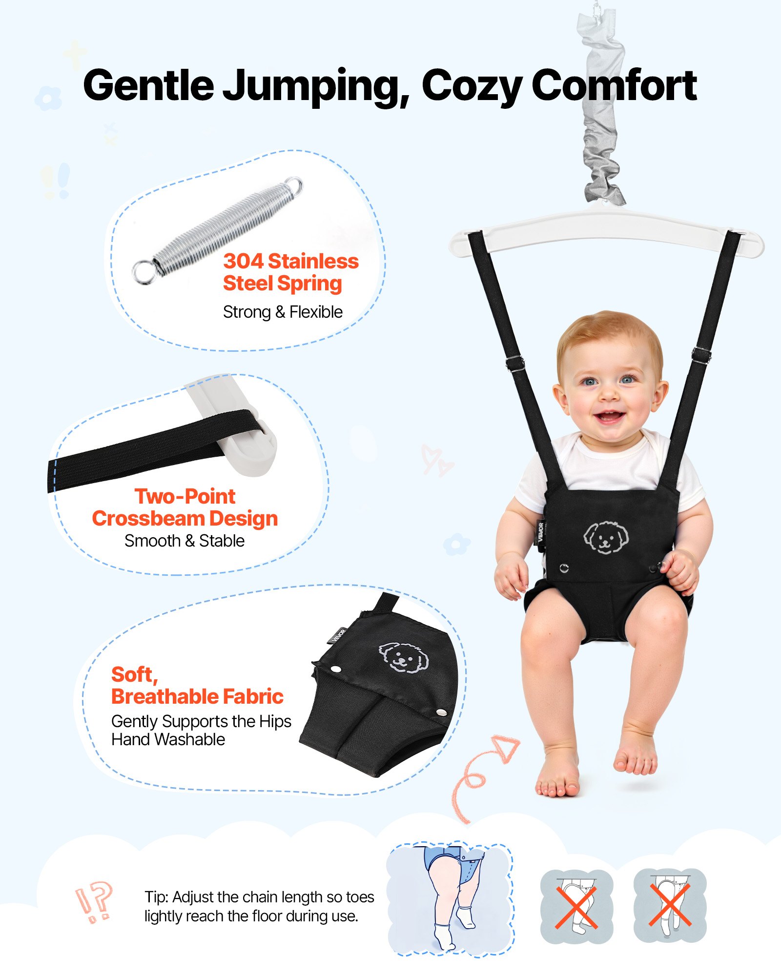 Secure Hanging: Adjustable hanging straps help reduce the risk of pinched fingers, and the stainless steel spring cord is built for repeated jumping. The swing and jumper set includes a sturdy carabiner clip that stays securely fastened