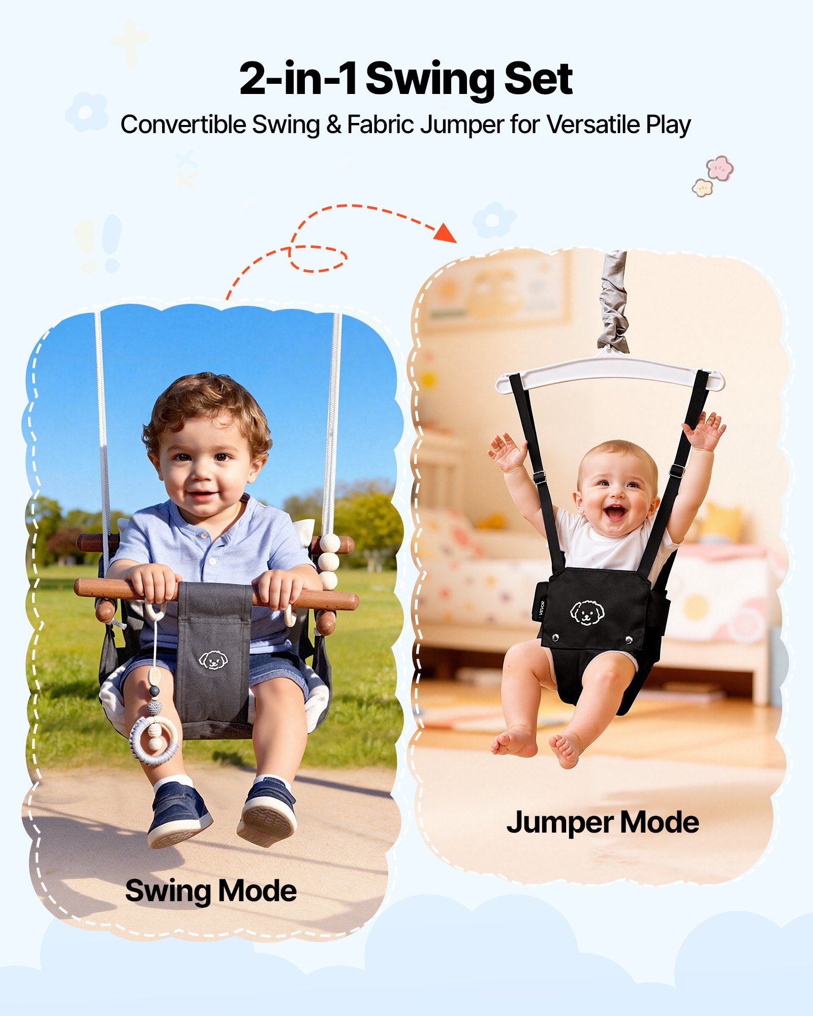 Swinging & Jumping: This toddler swing and jumper set supports two play modes, featuring a fabric toddler swing with adjustable ropes and a spring bounce seat for gentle swinging and jumping play