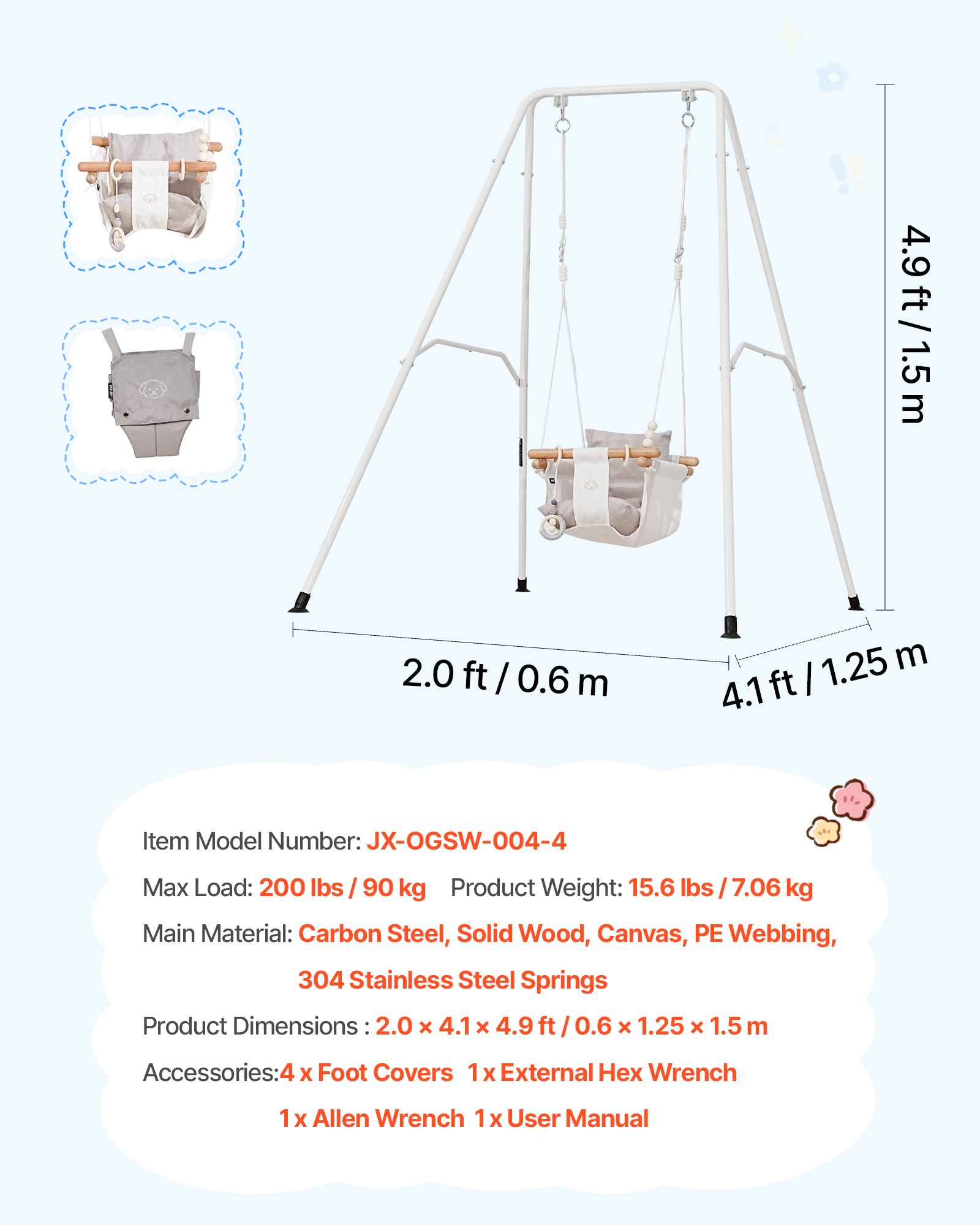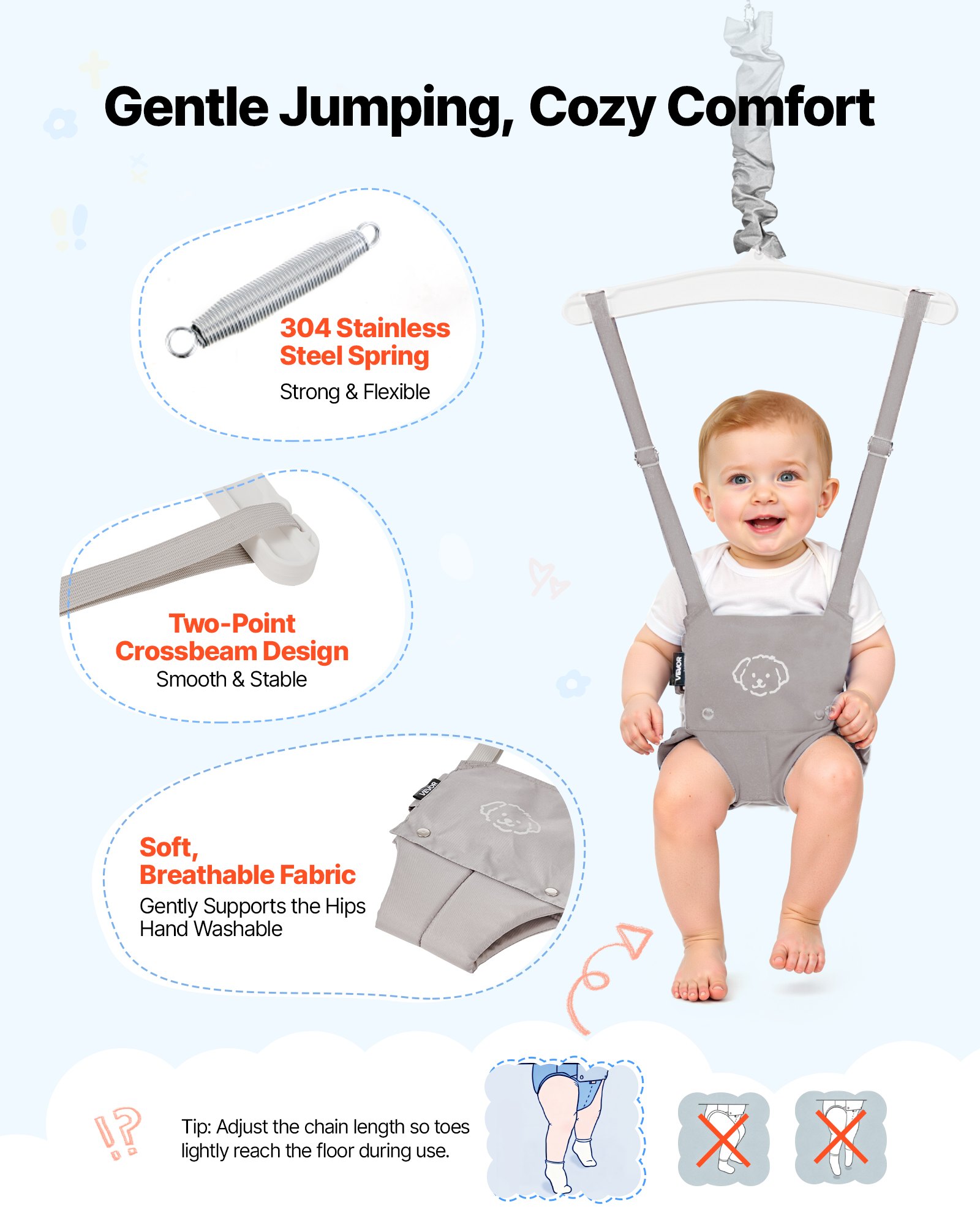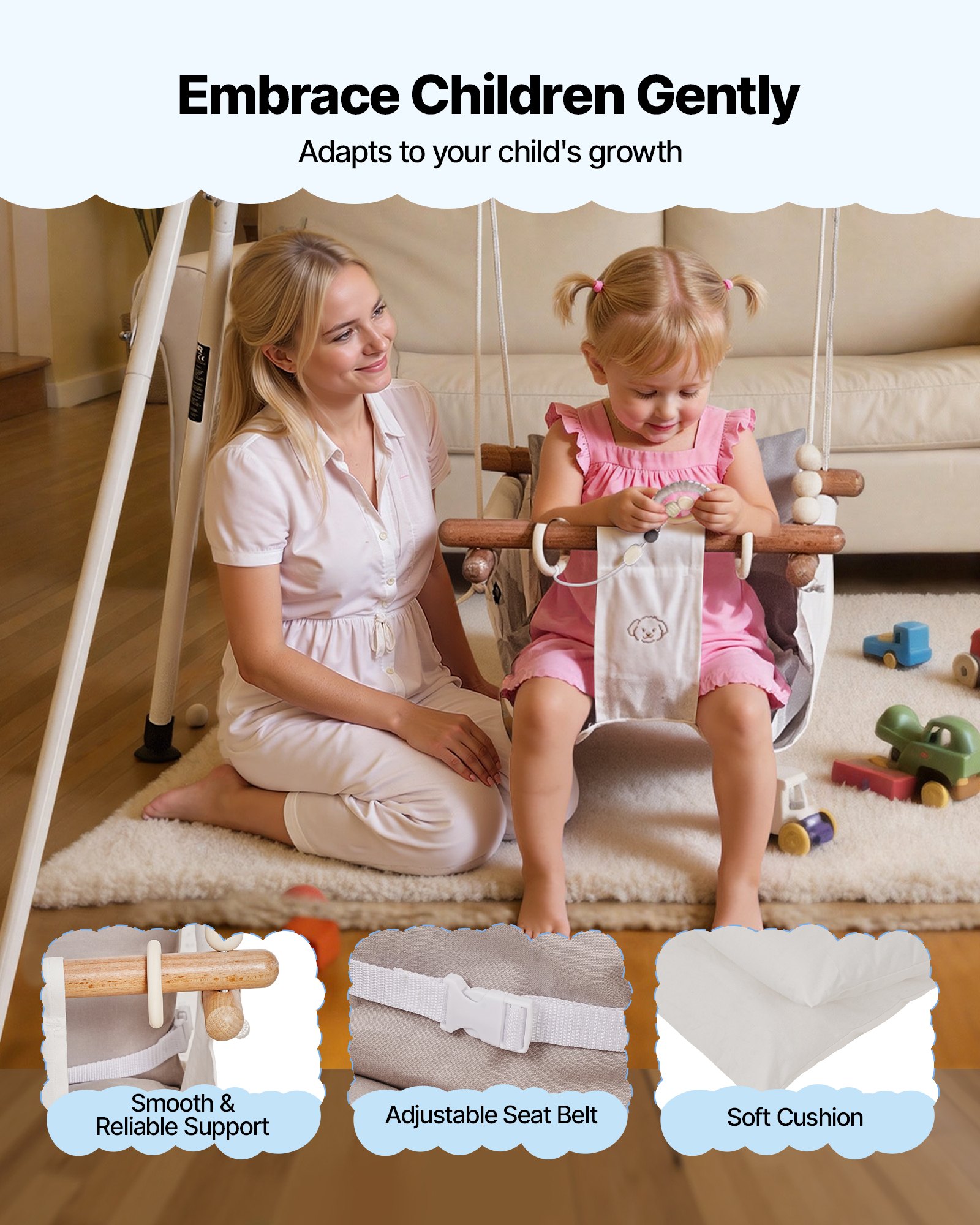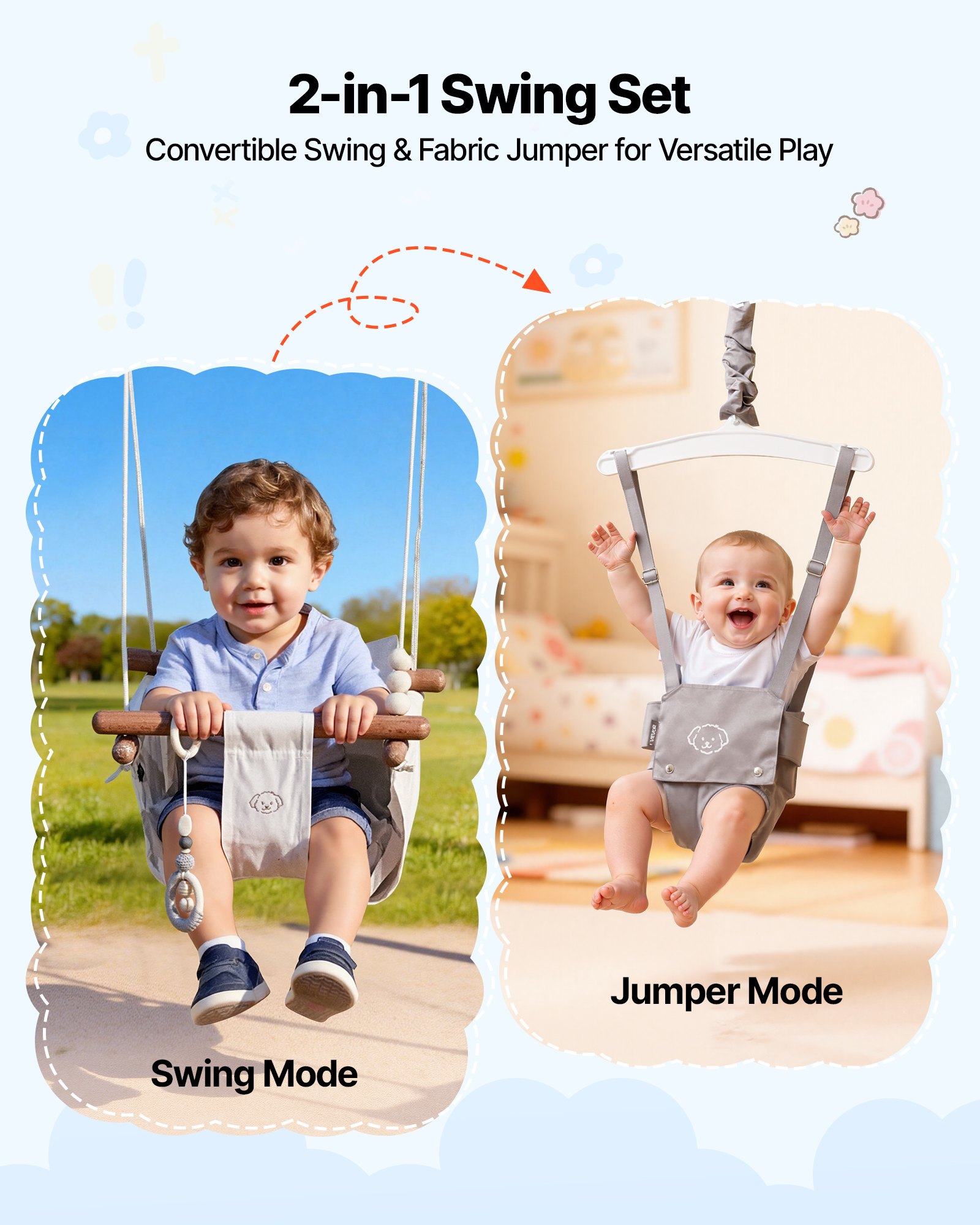Swinging & Jumping: This toddler swing and jumper set supports two play modes, featuring a fabric toddler swing with adjustable ropes and a spring bounce seat for gentle swinging and jumping play
