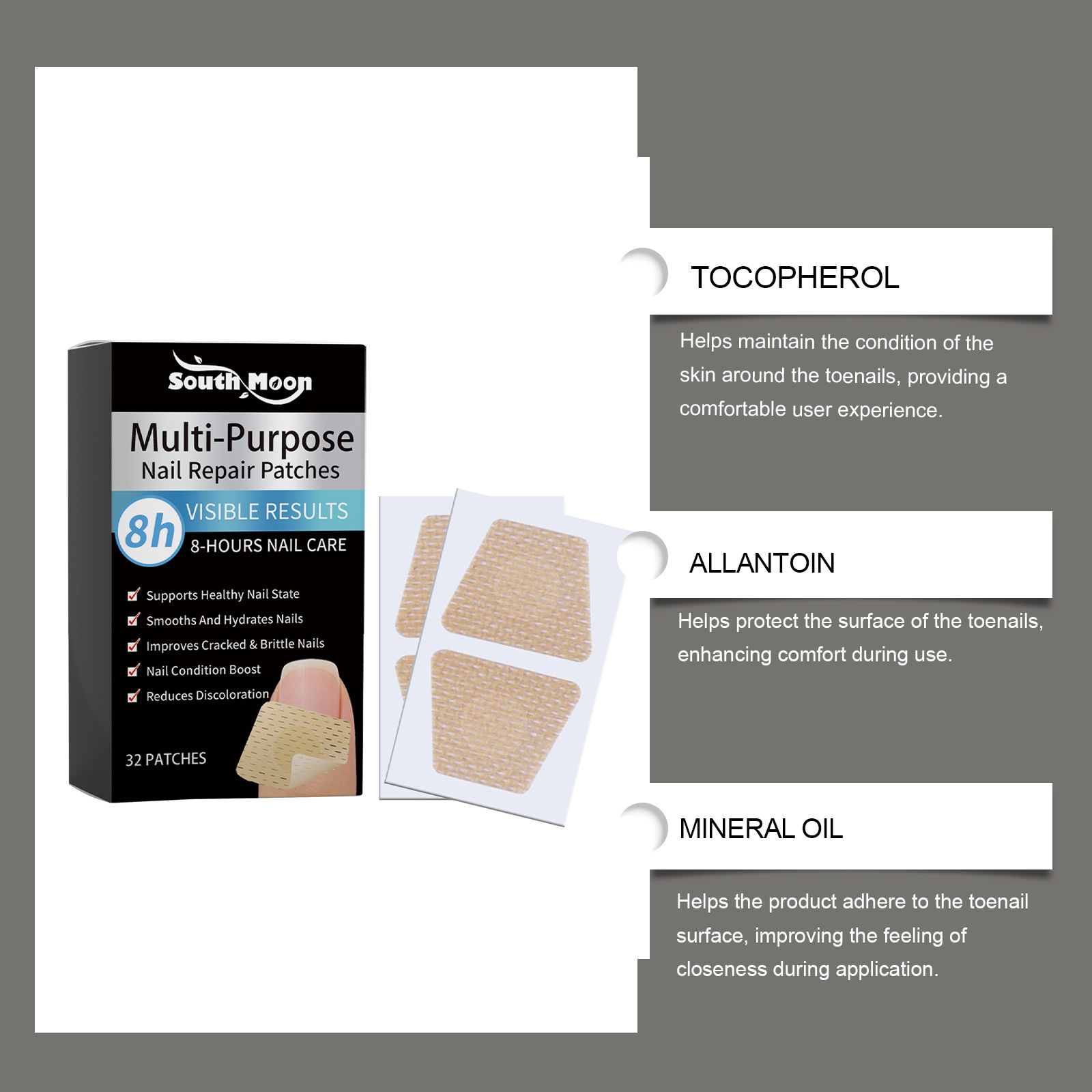 Ingredients: Active ingredients: tocopherol (vitamin E), allantoin, garlic bulb extract, Kochia scoparia fruit extract, snake bed fruit extract and tea oil.