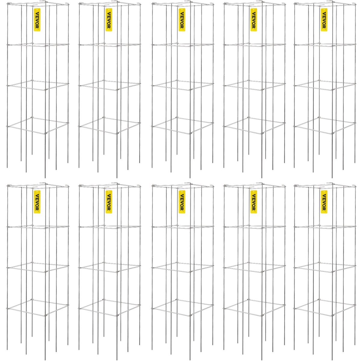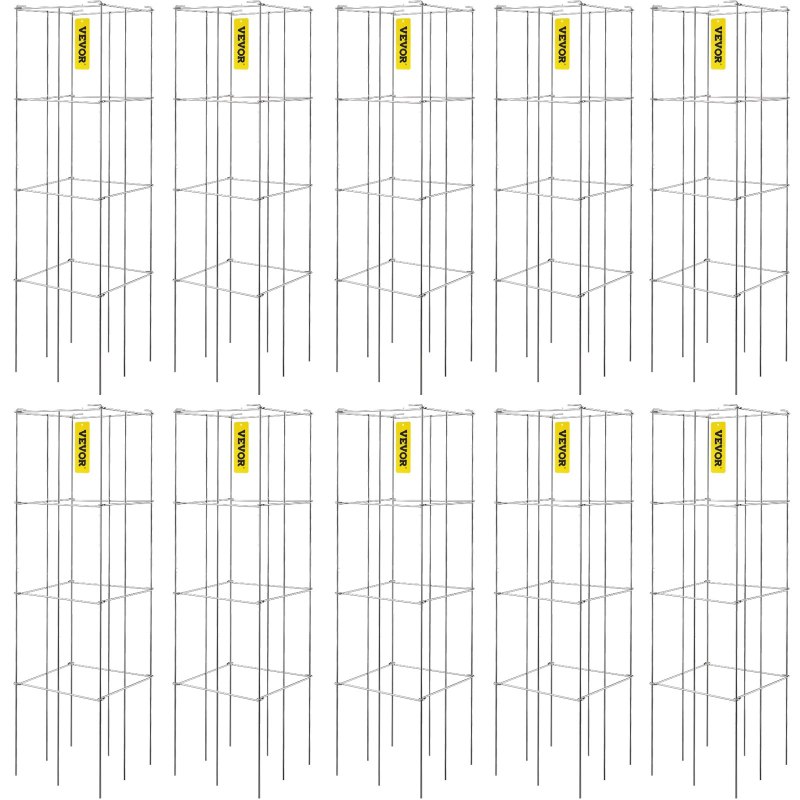 10 Packs 3-tier Trellis: 10 sets of 3-tier square trellis. 46.1"/ 117 cm high tomato cage is specifically designed to provide vertical climbing plants support, preventing the fruit, vegetable, and leaves from weighing down the stems or entangling with each other. The large 11.8"L x 11.8"W/ 30 x 30 cm openings square frame gives your plants more space to branch out, accessing for a bigger, cleaner harvest at growing seasons.