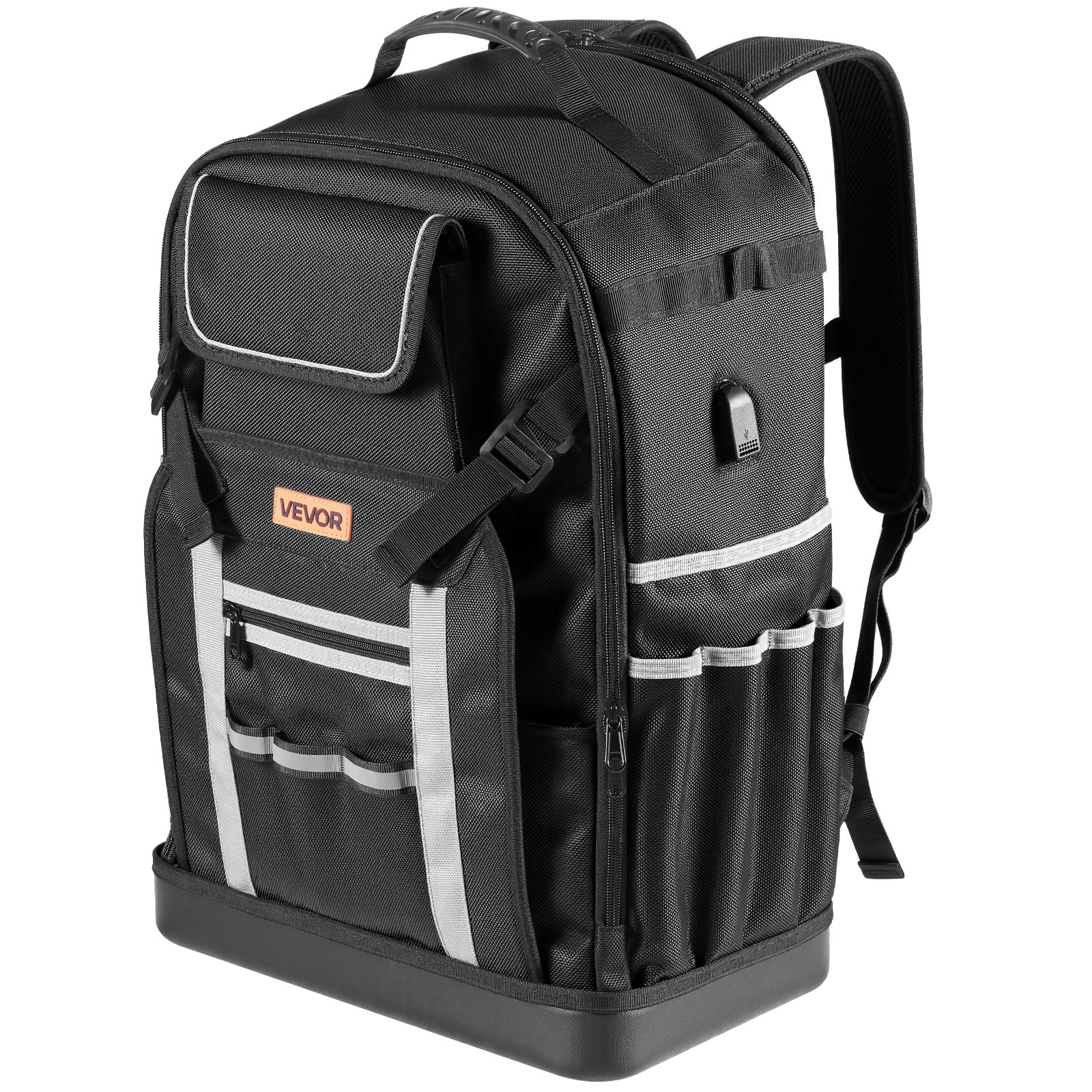 Features & Details 56 Pockets for Organization: This tool backpack (14.96 x 9.05 x 21.49 inches) holds up to 100 lbs and features 56 pockets, including a removable divider. Ideal for wrenches, drills, and more! Plus, it has a combination lock and charging port Durable & Long-lasting: Made from tough ballistic nylon, this packout backpack’s 1680D water-resistant fabric keeps liquids and dirt out. It’s lightweight at just 6.2 lbs, ready for any workday, anywhere—built to withstand the toughest conditions Ergonomic Design for Comfort: Say goodbye to shoulder strain! With wide, padded straps and adjustable chest buckles, this jobsite backpack makes carrying heavy tools a breeze. The breathable back panel keeps you cool, and the top handle adds versatility Stable Base for Easy Access: The PVC base keeps your electrician jobsite backpack steady, even when full! Place it anywhere without worrying about tipping or damage. It’s built to resist impacts, dampness, and sharp objects—protecting your tools all day long Your Great Work Companion: With reflective strips, this hard bottom backpack is easy to spot in low light. Ideal for electricians, plumbers, and anyone on the move! Whether on-site or outdoors, it’s an awesome gift for hardworking friends or family