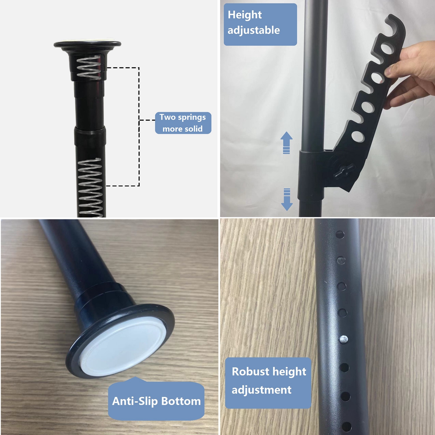 ADJUSTABLE SIZE: Our versatile coat hanger stand offers customizable height options, ranging from 65 inches to 124 inches vertically. Additionally, the inclusion of 6 adjustable hooks on the side ensures effortless accommodation of garments of varying lengths. Whether it's a bulky winter coat or a delicate dress, our coat rack stand provides ample space without touching the floor. The vertical rods are thoughtfully designed with springs, allowing for easy extension or contraction based on your needs. With these features, our coat rack, alongside the hat stand, guarantees a tailored storage solution for your wardrobe essentials.