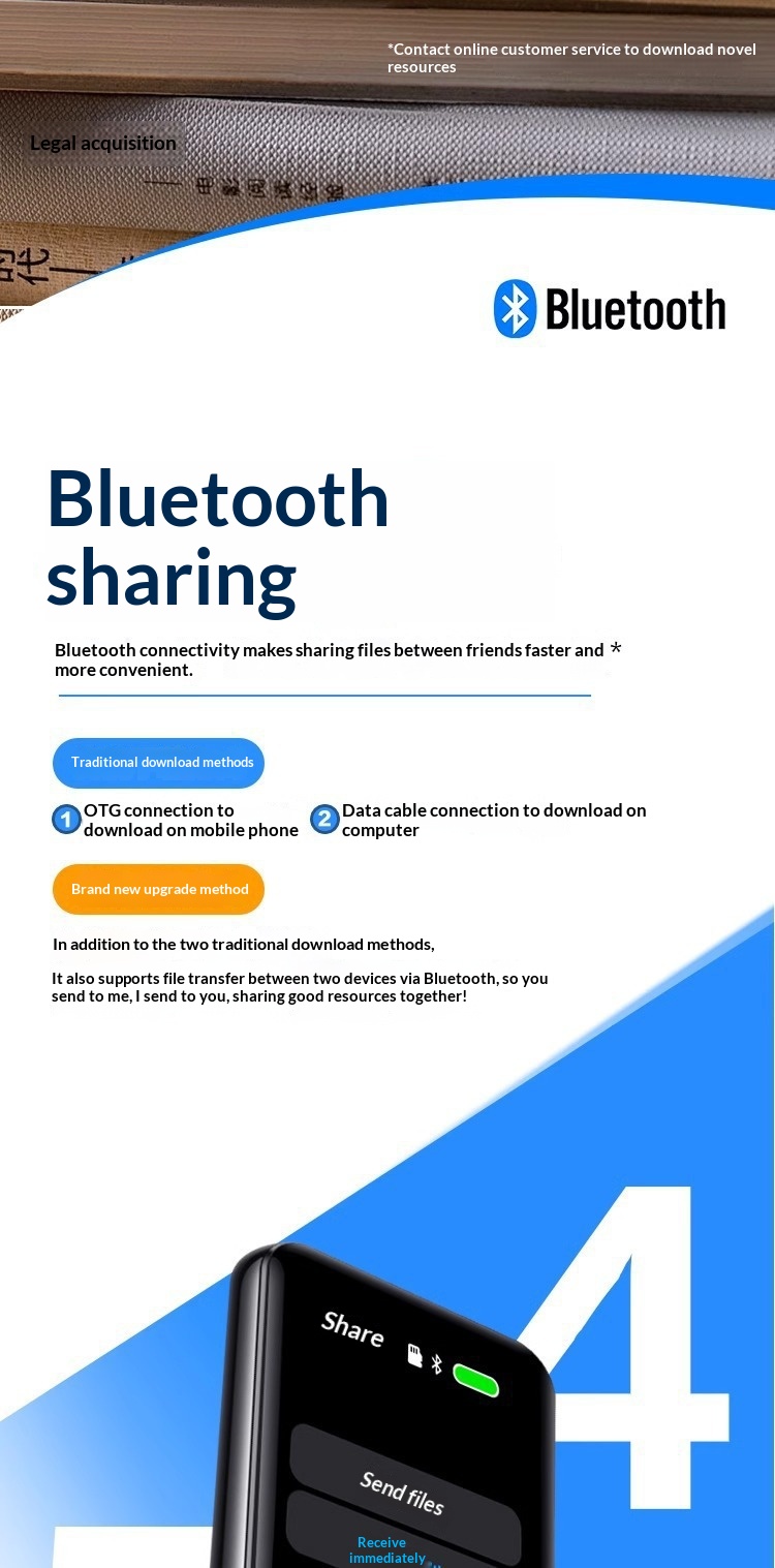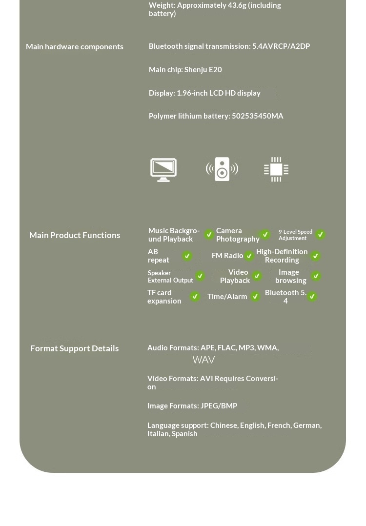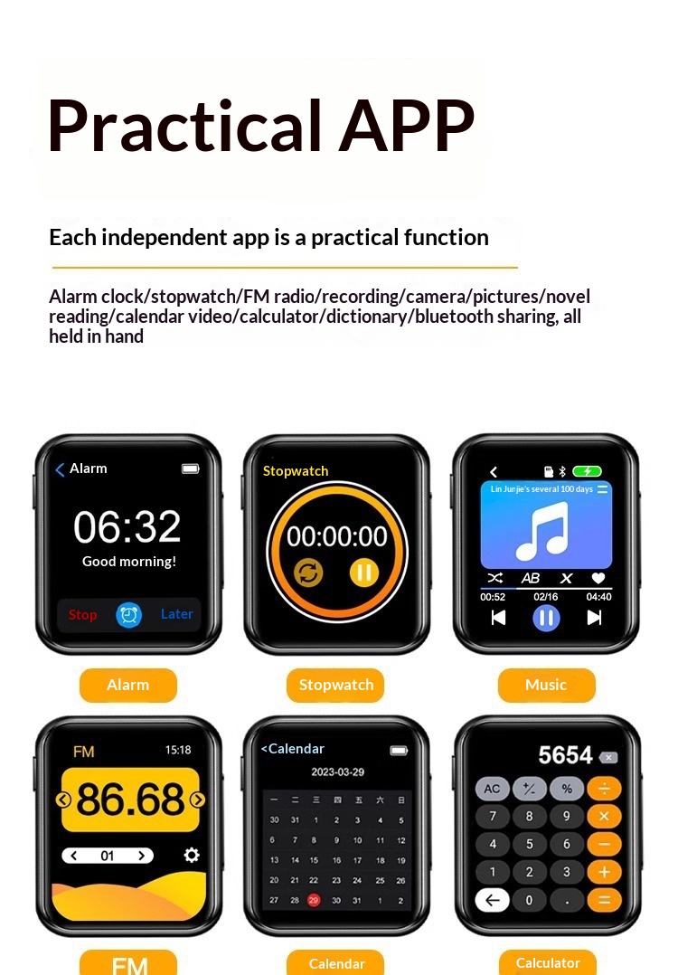 Additional functions: Supports Bluetooth, camera function, picture browsing, FM radio function, recording function, external playback function, e-book reading
