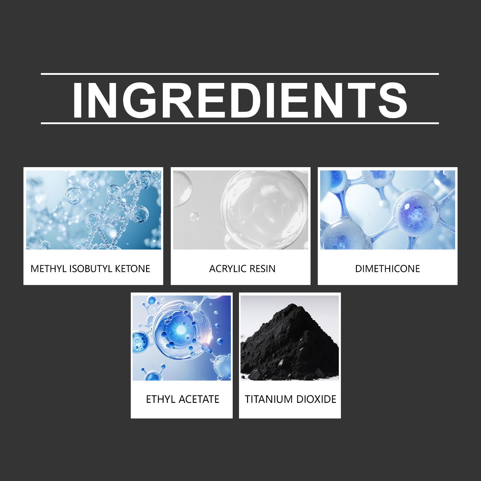 Ingredients: methyl isobutyl ketone, acrylic resin, ethyl acetate, titanium dioxide and polydimethylsiloxane.