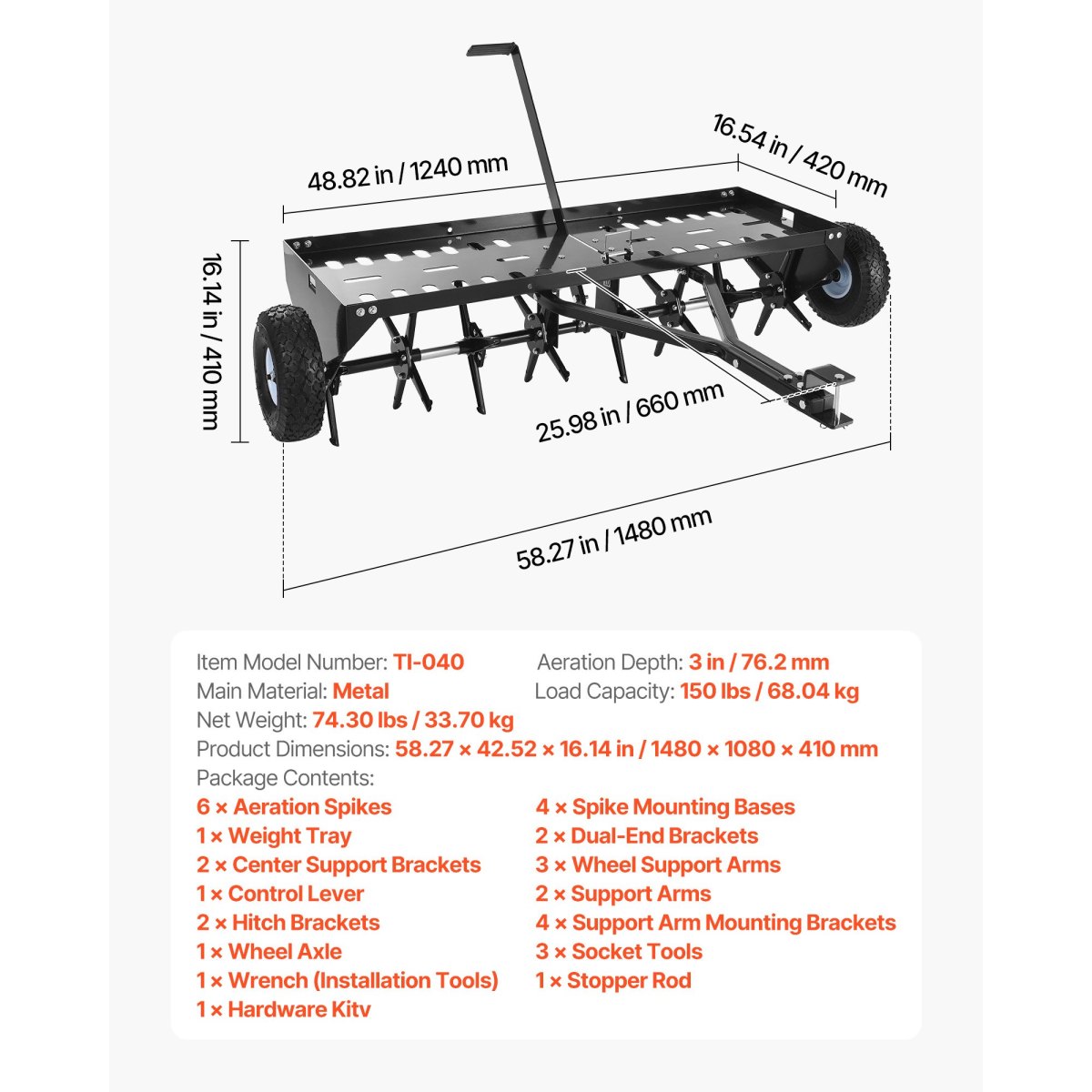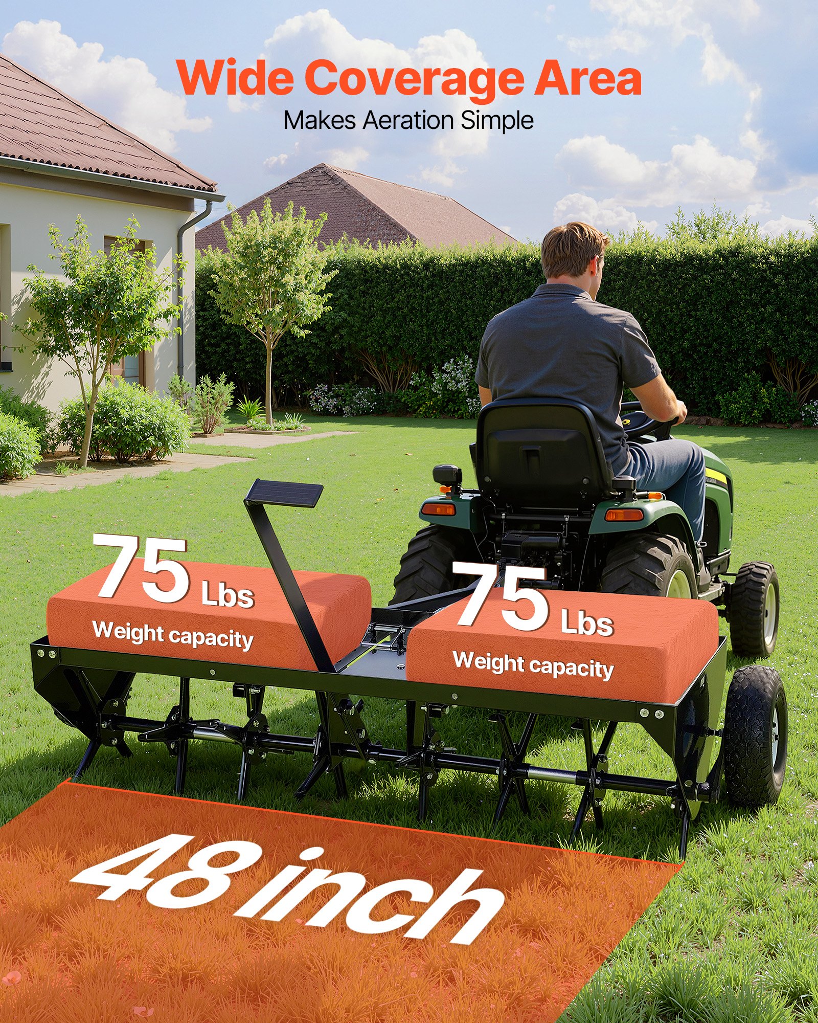 48-Inch Extra-Wide Working Width: This tow-behind core aerator features an ultra-wide 48-inch coverage, allowing you to aerate larger areas in fewer passes. Easily towed behind a lawn tractor or riding mower, it improves soil airflow and drainage to help your lawn recover faster