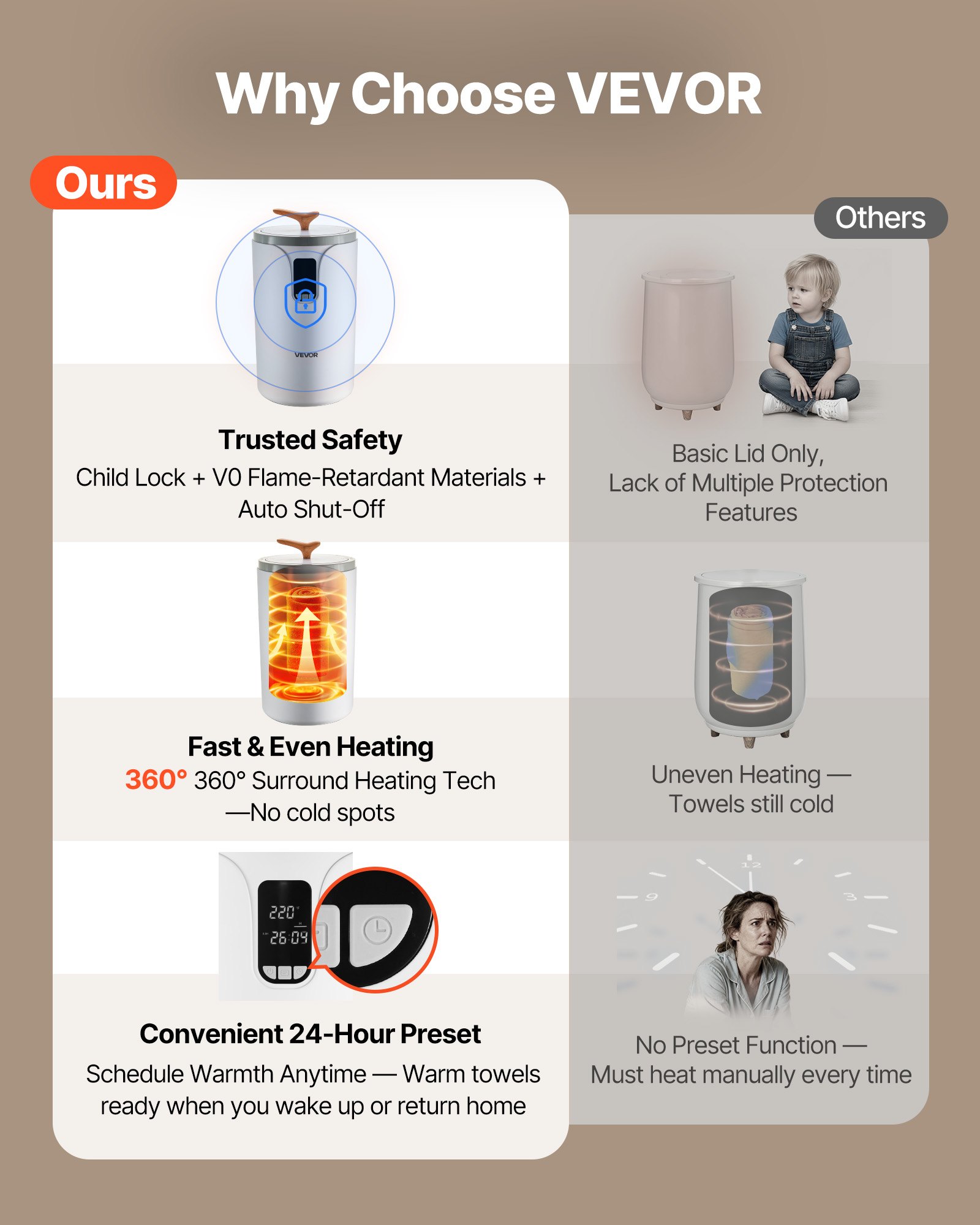 5-Side 360° Even Heating: Vevor's towel warmers for bathroom uses a 5-side 360° heating system (bottom + walls) to keep every inch of your towel toasty-warm—no more cold spots or uneven heat!