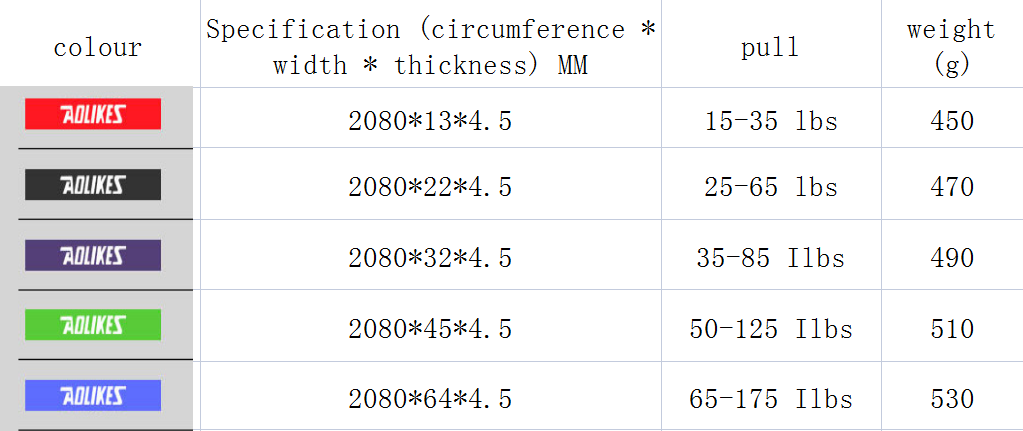 Weight: 2080*4.5*13mm red, 2080*4.5*22mm black, 2080*4.5*32mm purple, 2080*4.5*45mm green, 2080*4.5*64mm blue (kg)