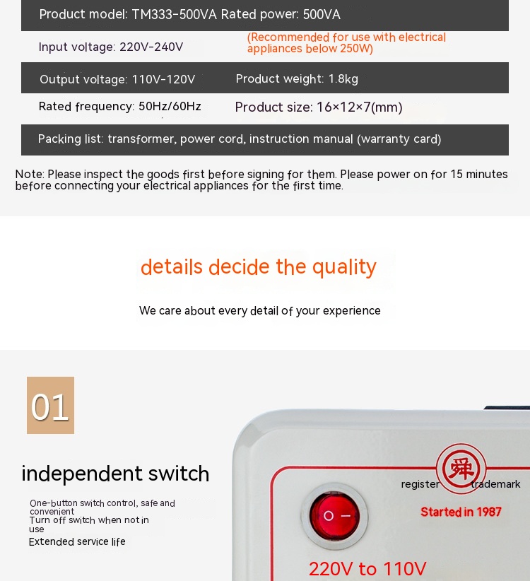 Product information:Specification: 500W 220 to 110 for domestic use, 500W 110 to 220 for foreign useImport or not: no
