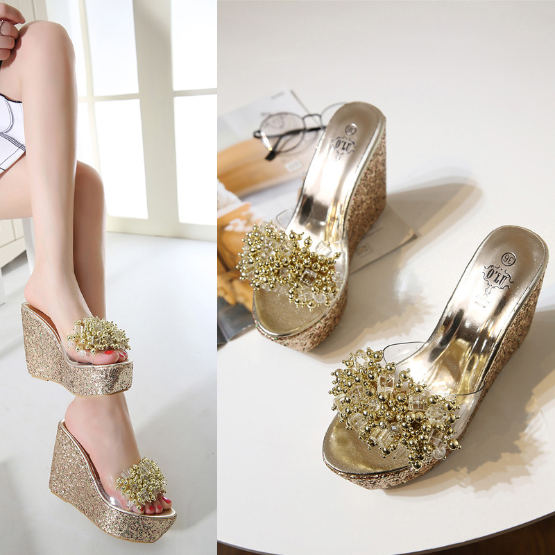 Transparent Rhinestone Slope With High-heeled Sponge Cake Sandals And Slippers