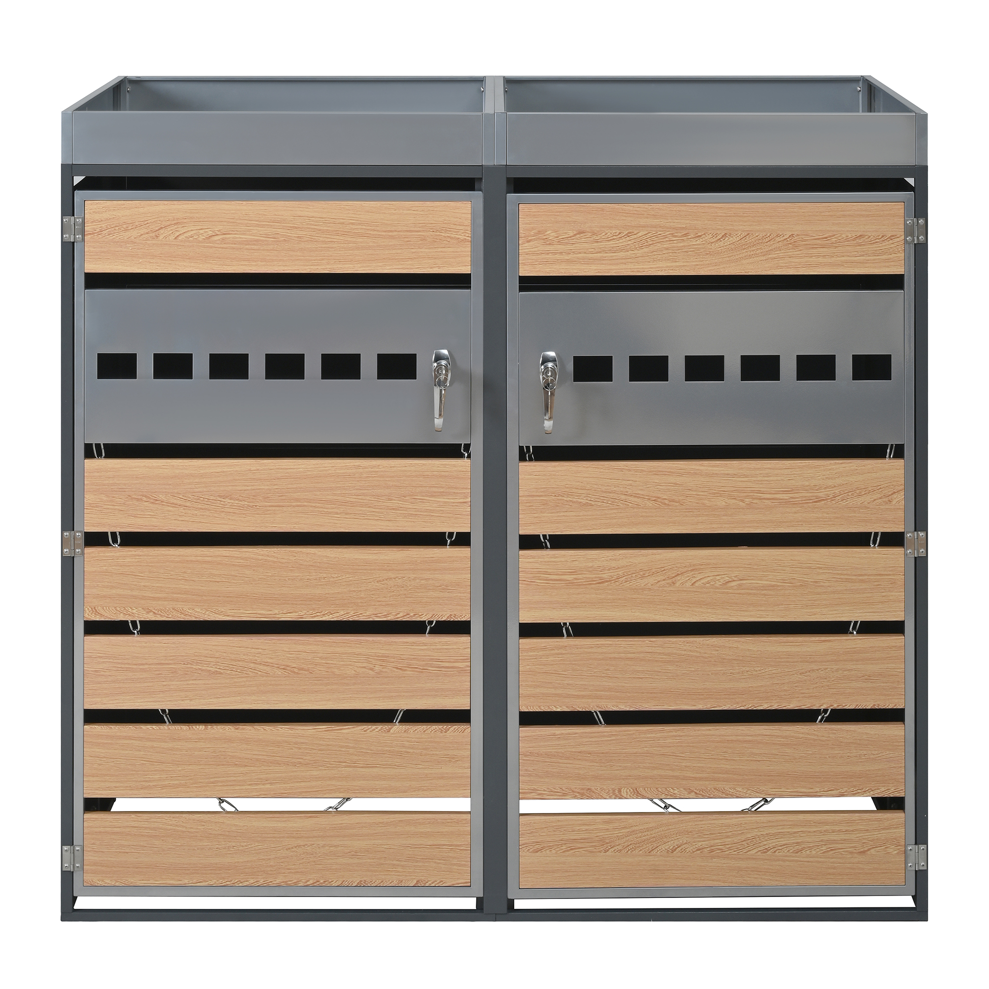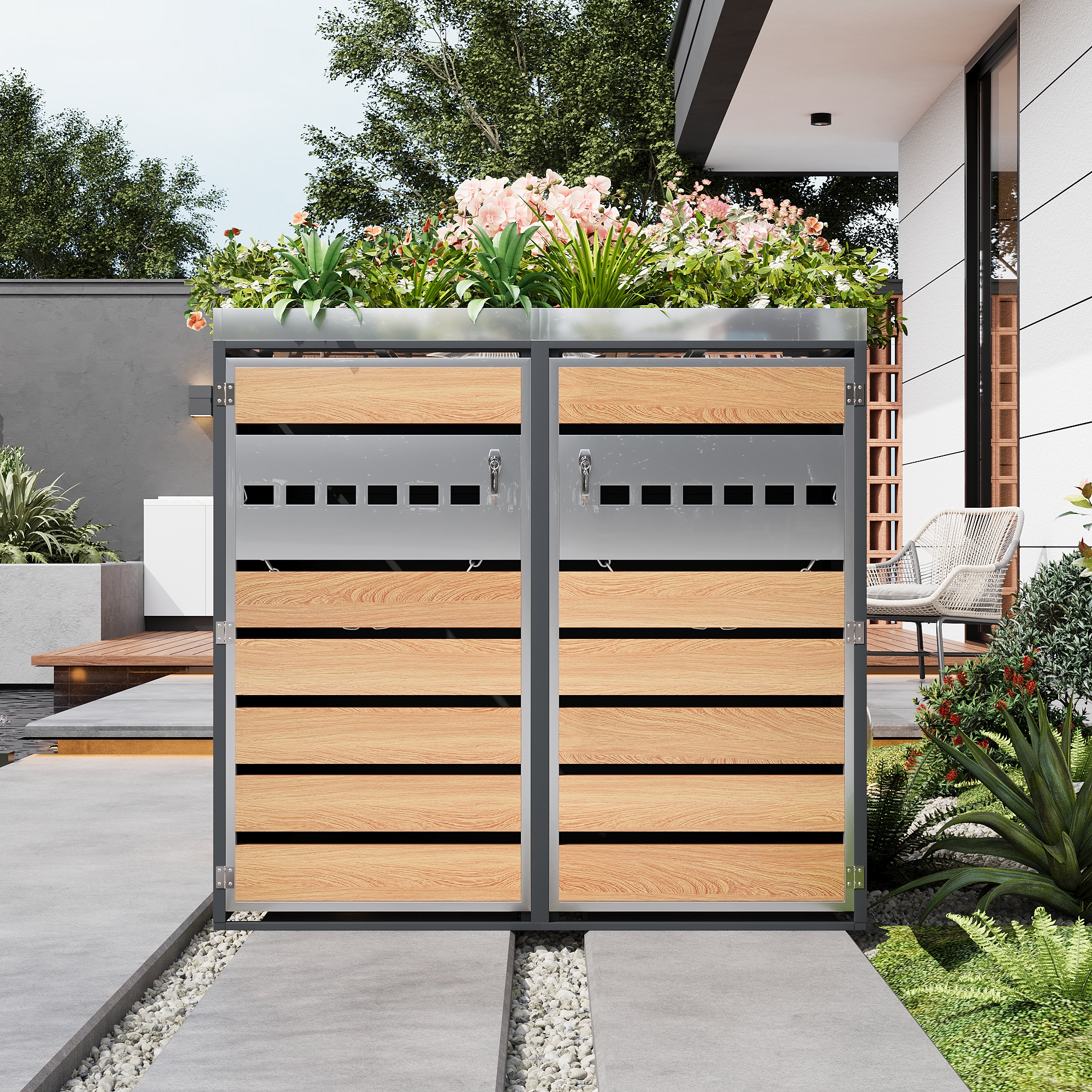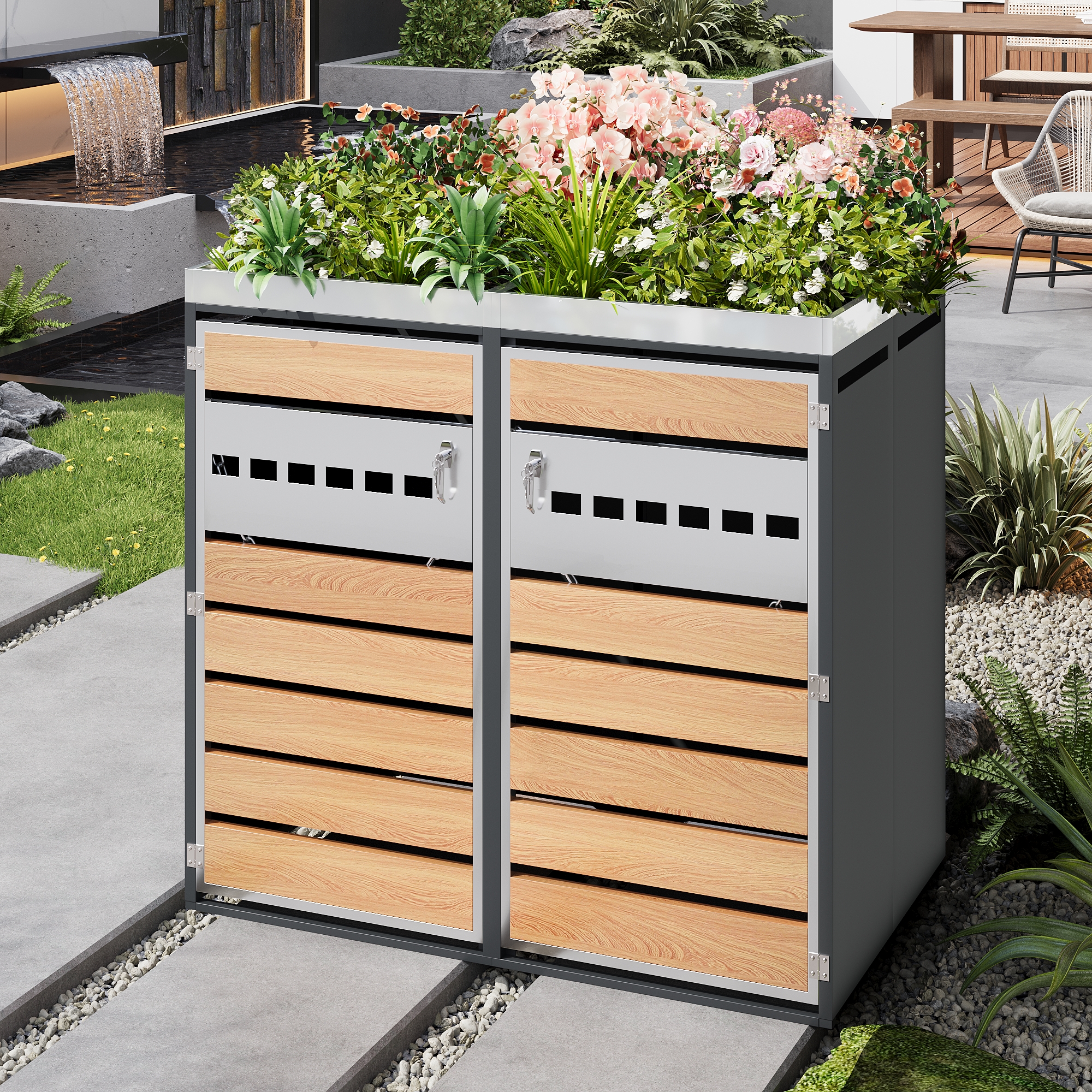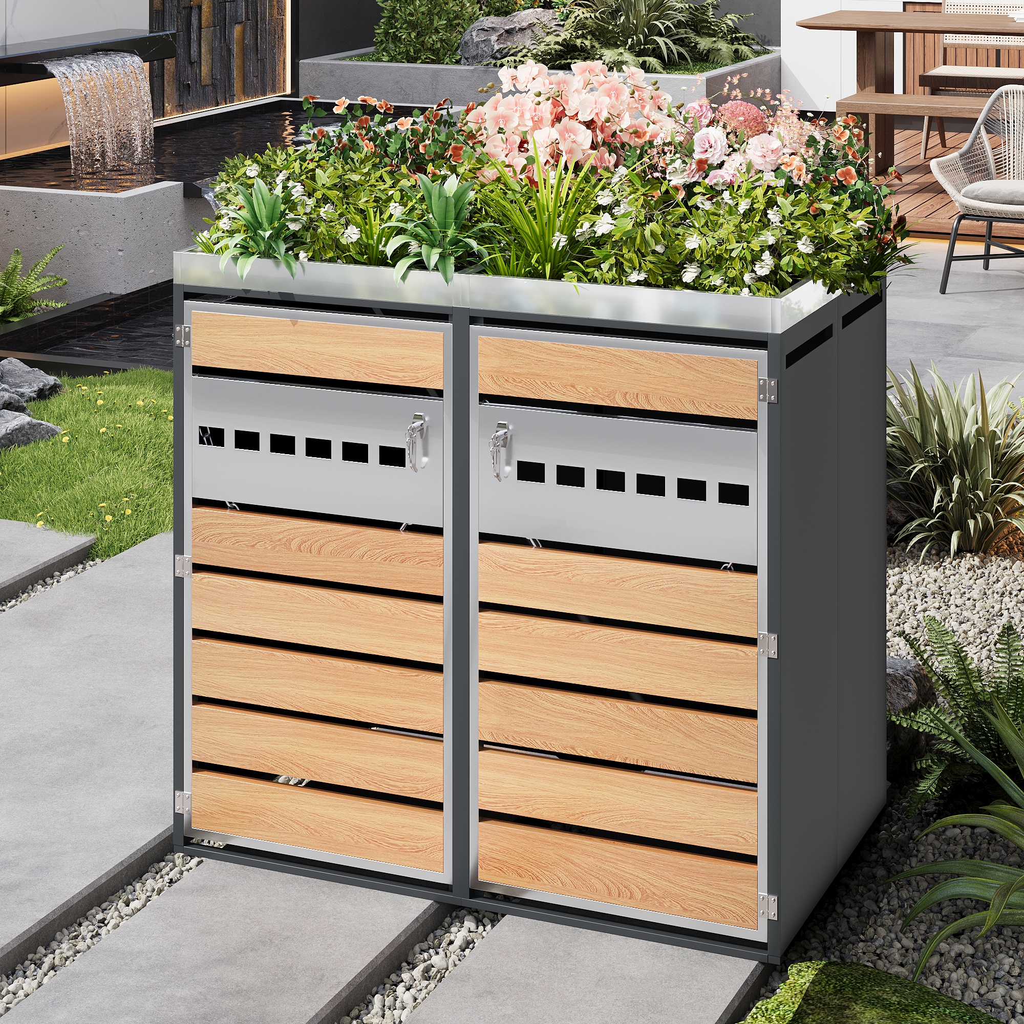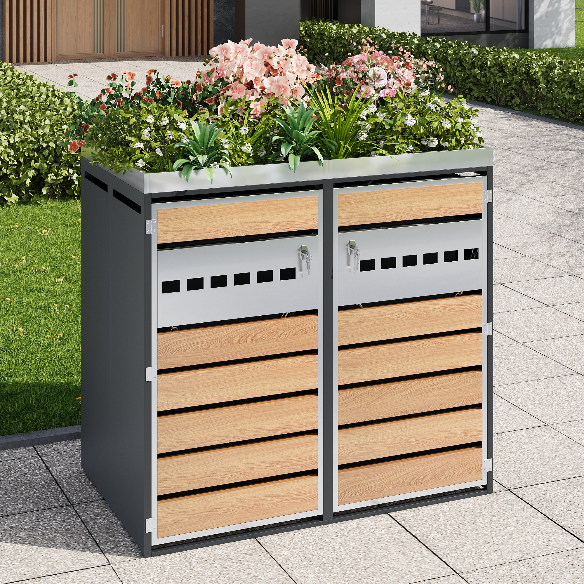 This lockable, two-part bin storage unit with integrated planter sets new standards for outdoor storage with its unique design. The upper planter is ideal for flowers and plants and flows seamlessly into the lower, two-part bin compartment, combining storage and garden design. The cabinet door, a combination of horizontal wood grain blocks and perforated metal strips, creates a striking contrast between natural texture and industrial style while ensuring optimal ventilation. Each of the two separate compartments accommodates two standard-sized bins. The lockable door provides security, while the integrated chain stops facilitate easy access. The galvanized steel housing is rust- and corrosion-resistant, robust, and durable, complementing a variety of interior design styles. This bin storage unit is not only a practical waste separation aid but also an aesthetically pleasing element that enhances the look of your garden.