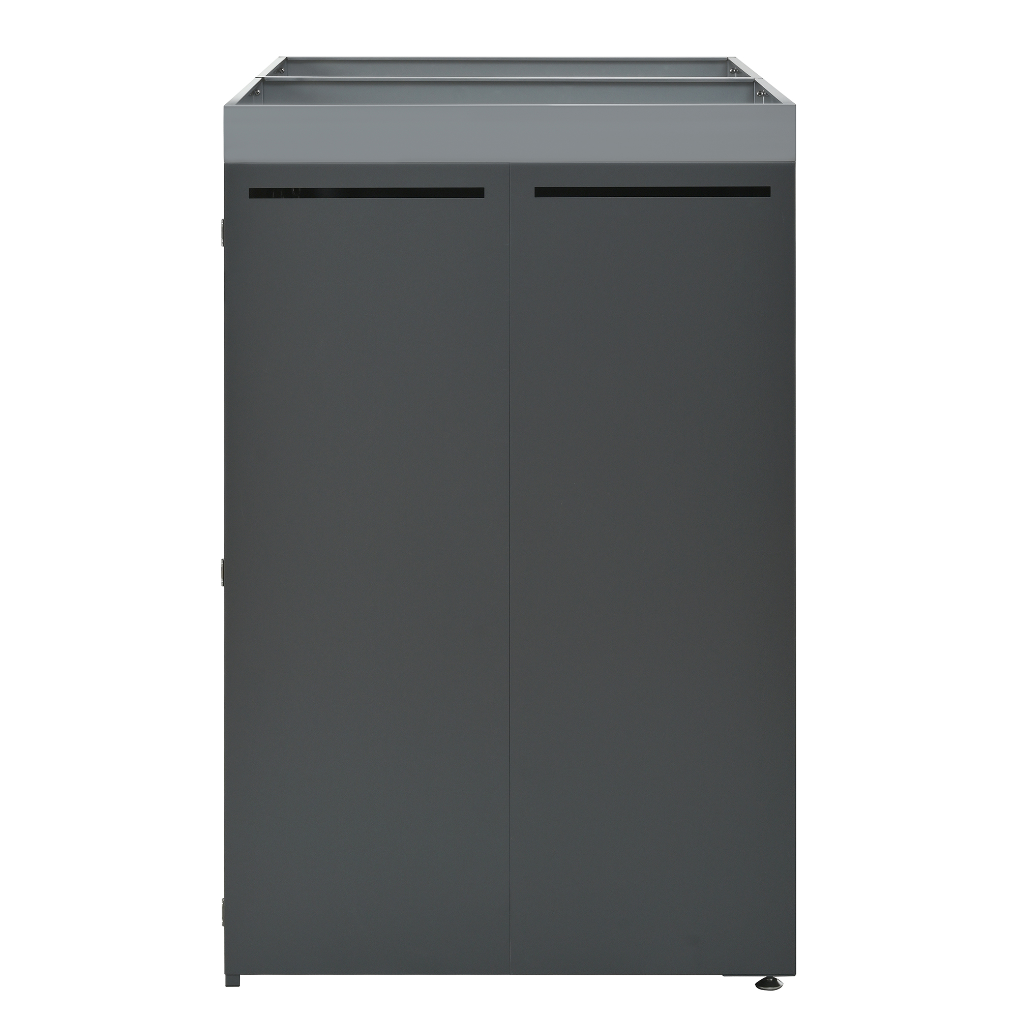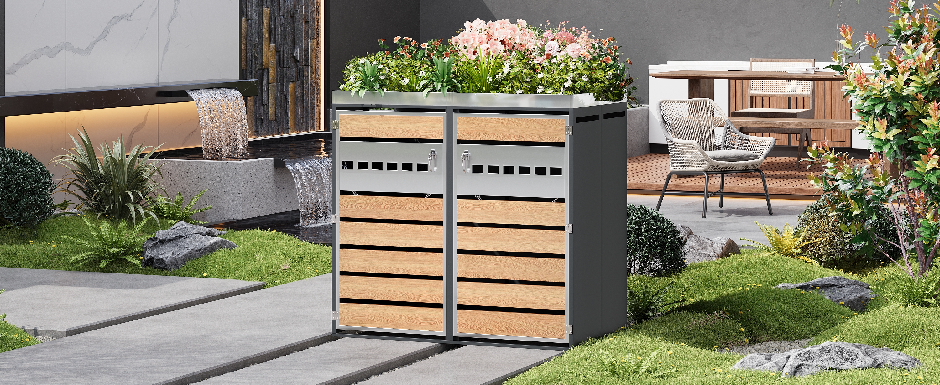 1. Integrated planter 2. Horizontal door panels with a wood look – simple and elegant 3. Ventilation openings reduce odors 4. Two separate compartments for optimal storage 5. Galvanized steel – rustproof, weather-resistant, and durable 6. Lockable cabinet doors for added security and to prevent tipping 7. Suitable for various outdoor areas