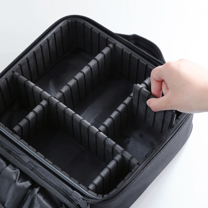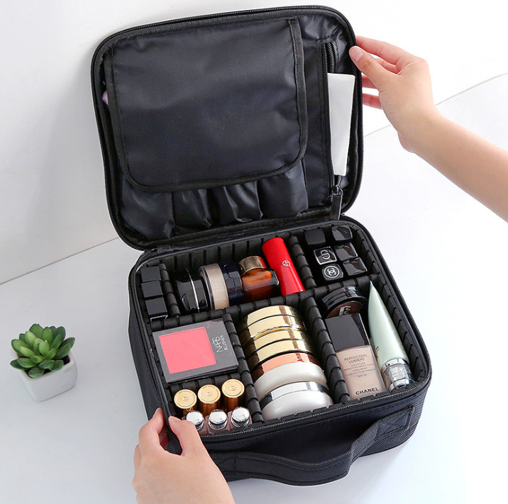 description Made of high quality Oxford Fabric, this portable makeup train case is waterproof and anti-wear. as it is designed with various brush pockets and adjustable dividers, the case can keep different types of makeup tools, cosmetics and even toiletries. if you are going for a trip or a makeup training, this should be your ideal choice. feature -black color. -Material: Oxford cloth-standard: 26x9x23 cm. -THE MATERIALS OF HIGH QUALITY. this makeup box is waterproof and anti-wear. - ADJUSTABLE LIBRARIES. you can adjust the grid sizes according to your need. -BUSINESS BRUSHES WITH COVER. this design can prevent your brushes or other tools from being scattered and protect your case from getting dirty. - A WIDE RANGE OF USE. you can keep cosmetic accessories such as lipstick, shade, foundation, makeup brushes and skin care profucts. you can also keep toiletries such as toothbrushes and shampoo. -Easy to CLEAN. wipe wet towels with clean water and you can remove dirt. 1 x Makeup Case Train