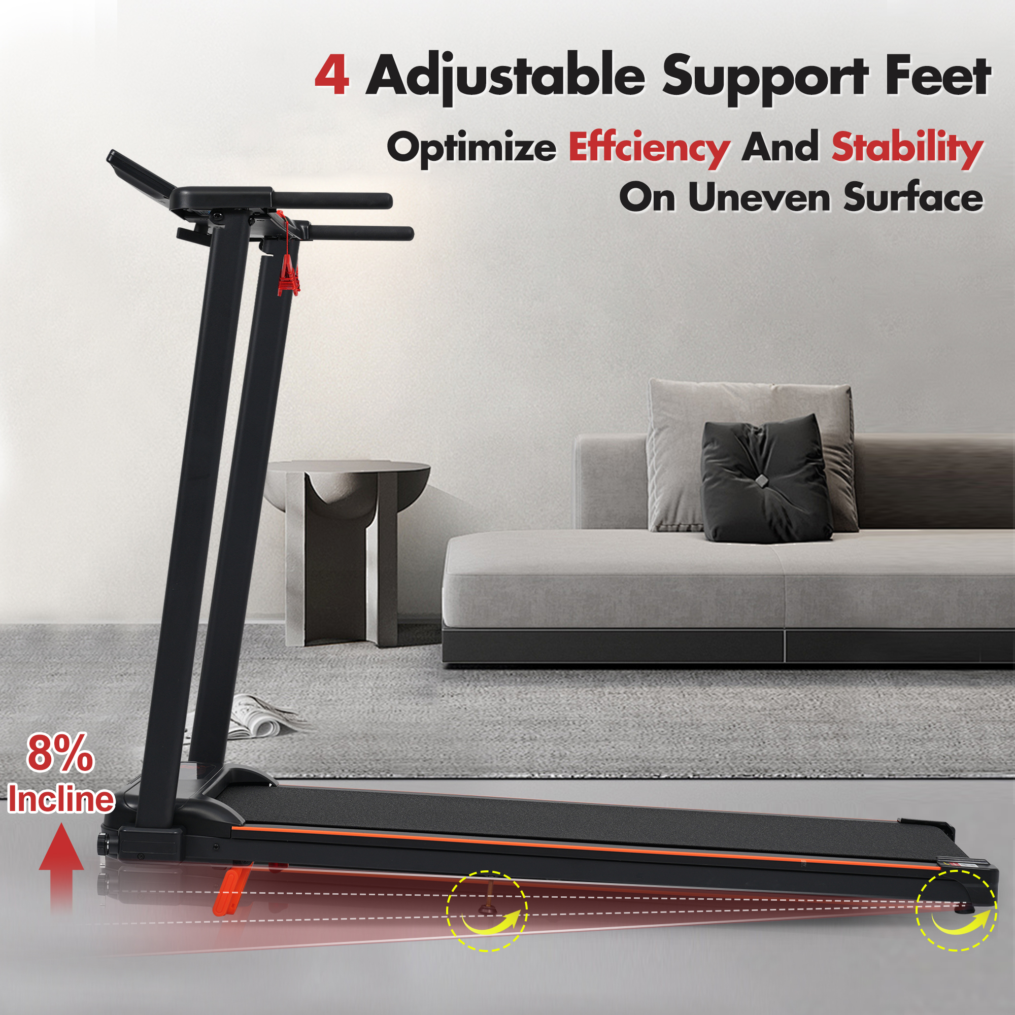 Product Name:Treadmill with 8% Incline, Portable Treadmills for Home with Handle, Foldable Treadmills with 265 Lbs Capacity, 3.0HP Treadmill with 4 Adjustable Support Feet