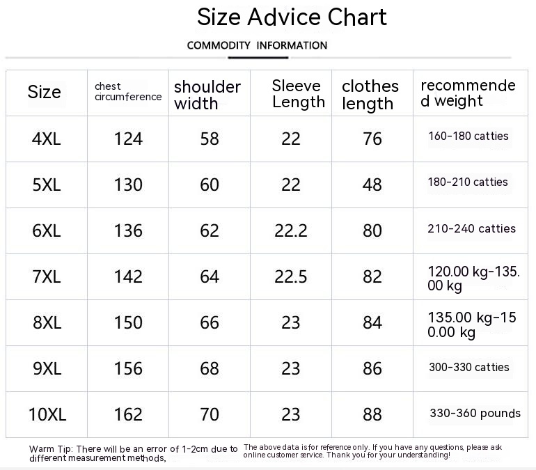 Size: 4XL (recommend 80.00kg-90.00kg,5XL (recommend 90.00kg-105.00kg,6XL (recommend 105.00kg-120.00kg,7XL (recommend 120.00kg-135.00kg,8XL (recommend 135.00kg-150.00kg, 9XL (recommend 150.00kg-165.00kg, 10XL (recommend 165.00kg-180.00kg))