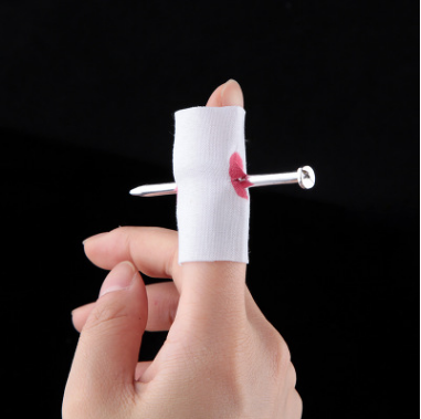 The nail is bent around your finger but bandage makes it look as if it has gone right through and you are bleeding