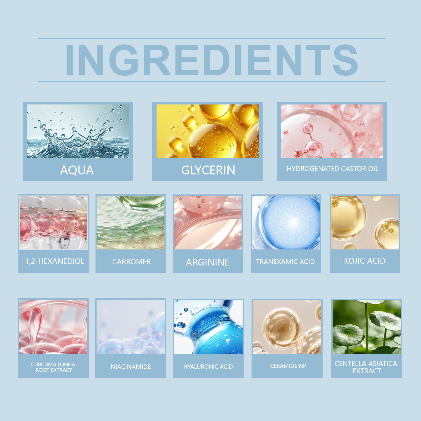 Product Ingredients: Water, Glycerin, Hydrogenated Castor Oil, 1,2-Hexanediol, Carbomer, Arginine, Tranexamic Acid, Kojic Acid, Turmeric Root Extract, Niacinamide, Hyaluronic Acid, Ceramide NP, Centella Asiatica Extract