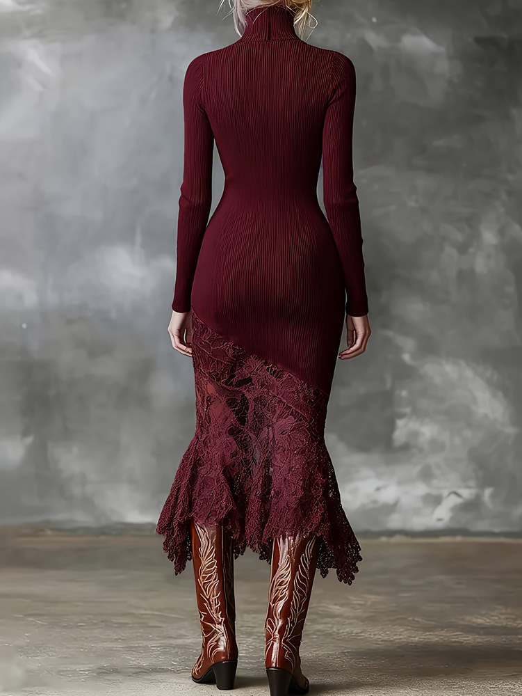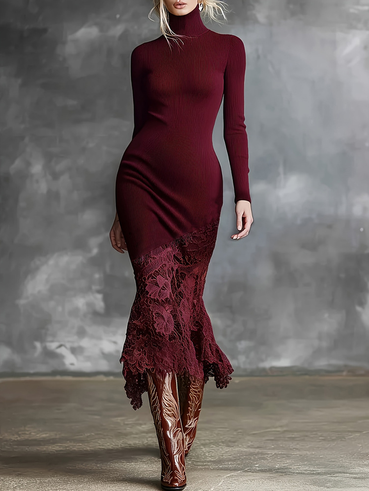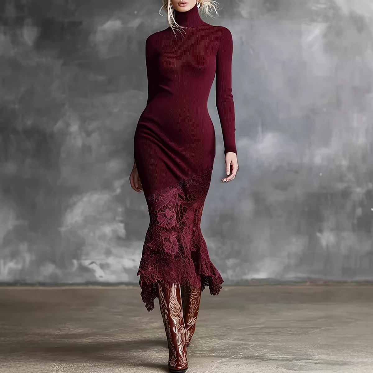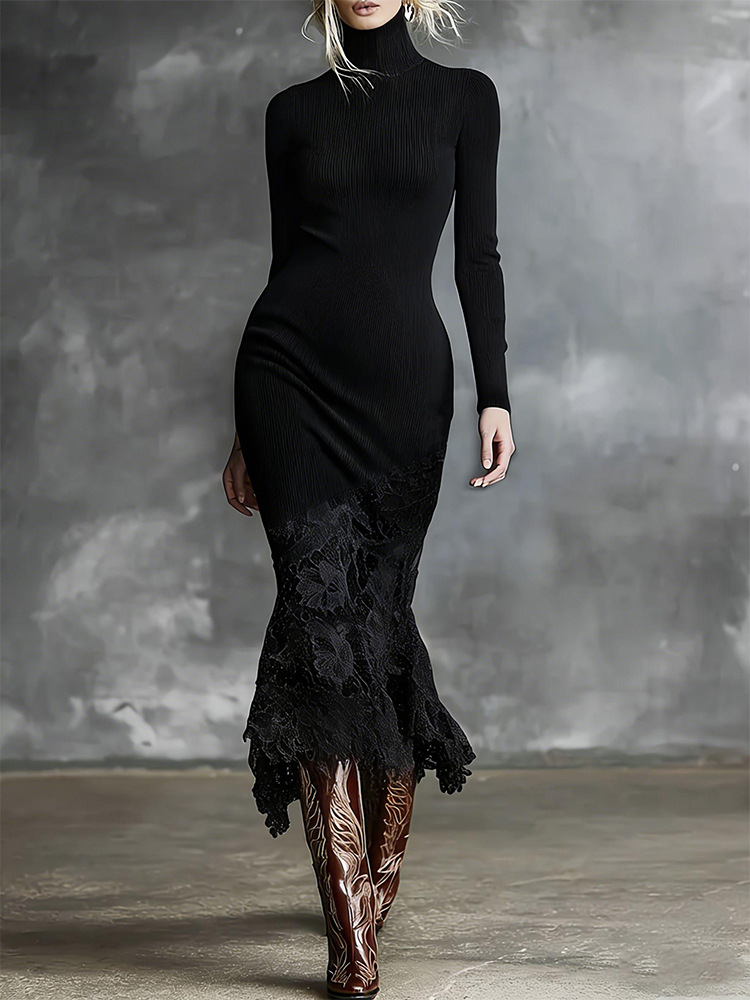Turtleneck Knit Dress With A Lace Hema Sophisticated Mid-length Skirt