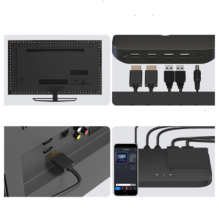 Applicable to computer TVs within 43-60 inches: (Configuration: light strip (60 lights per meter) 2 meters light strip * 2, adapter 6A (good quality, relatively heavy), synchronization box, buckle double-sided tape * 4, HDIM cable (pure copper bold)*1, manual*1)