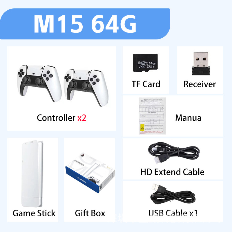 Packing list: one host, one HDMI, one USB charging cable, two wireless handles