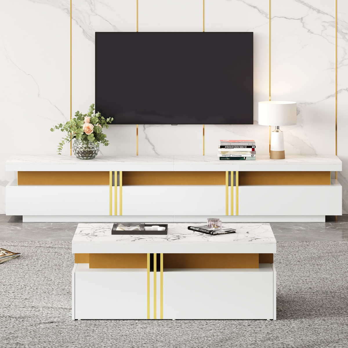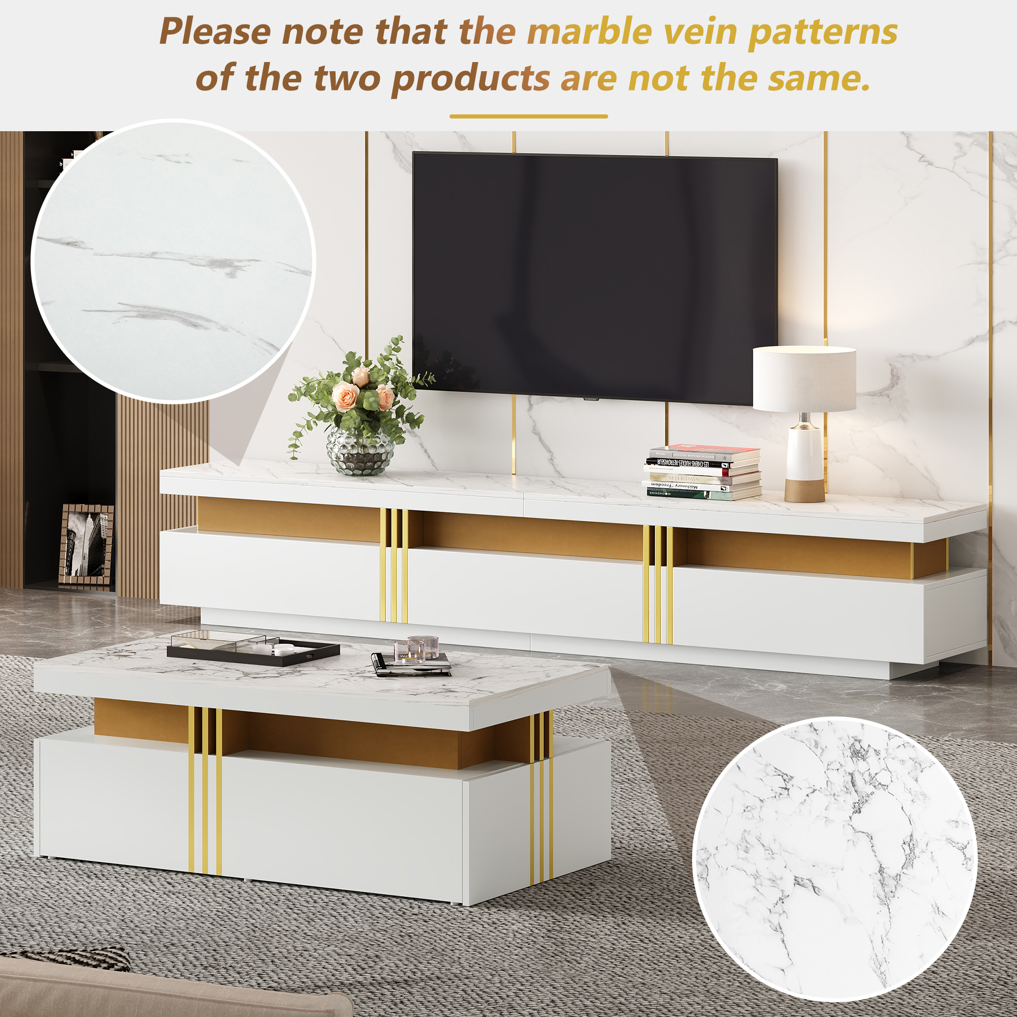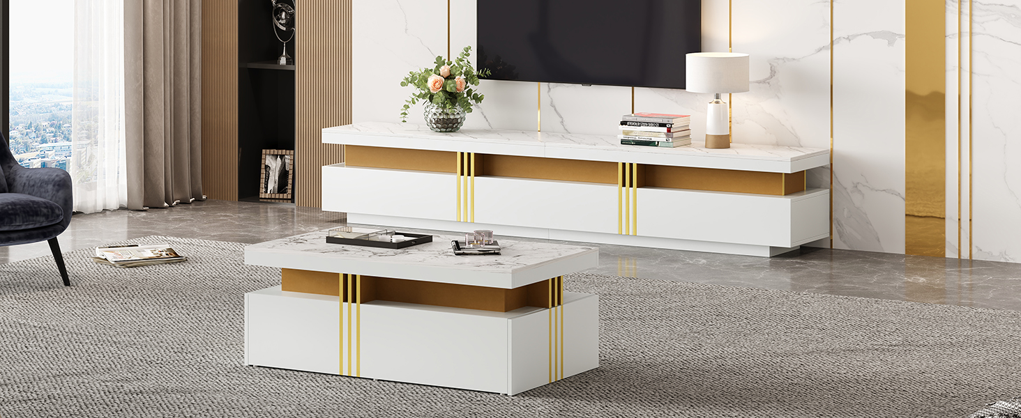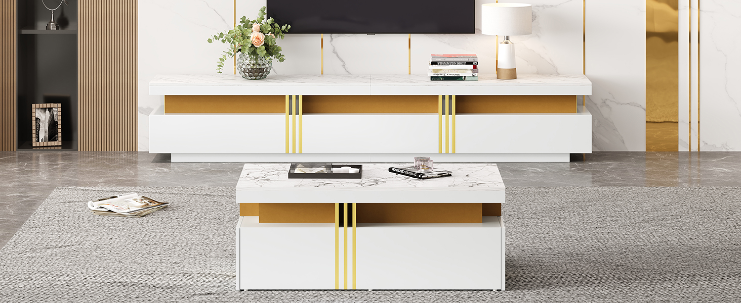 - Modern Minimalist Style Combination: The TV stand and coffee table feature a unified imitation marble top. This modern, minimalist style is clean and refined, perfectly blending into any living space and enhancing the overall aesthetic.