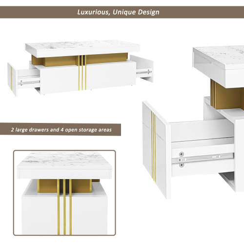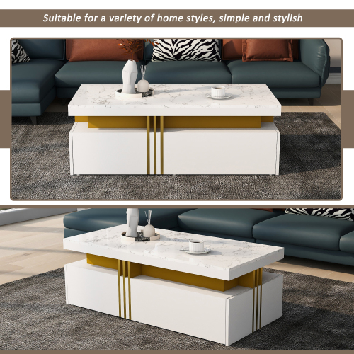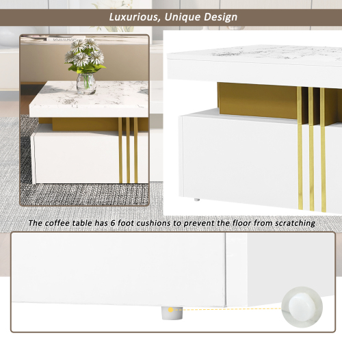 This modern, minimalist furniture set consists of a TV stand and coffee table. They feature a unified faux marble top that blends seamlessly with any home style. Both the TV stand and coffee table are made of durable, eco-friendly particleboard. The TV stand features three drawers, providing ample storage space. The coffee table features two drawers on each side, perfect for storing small items like books and remote controls. This furniture set is both practical and beautifully designed, making it the perfect choice for your living room.