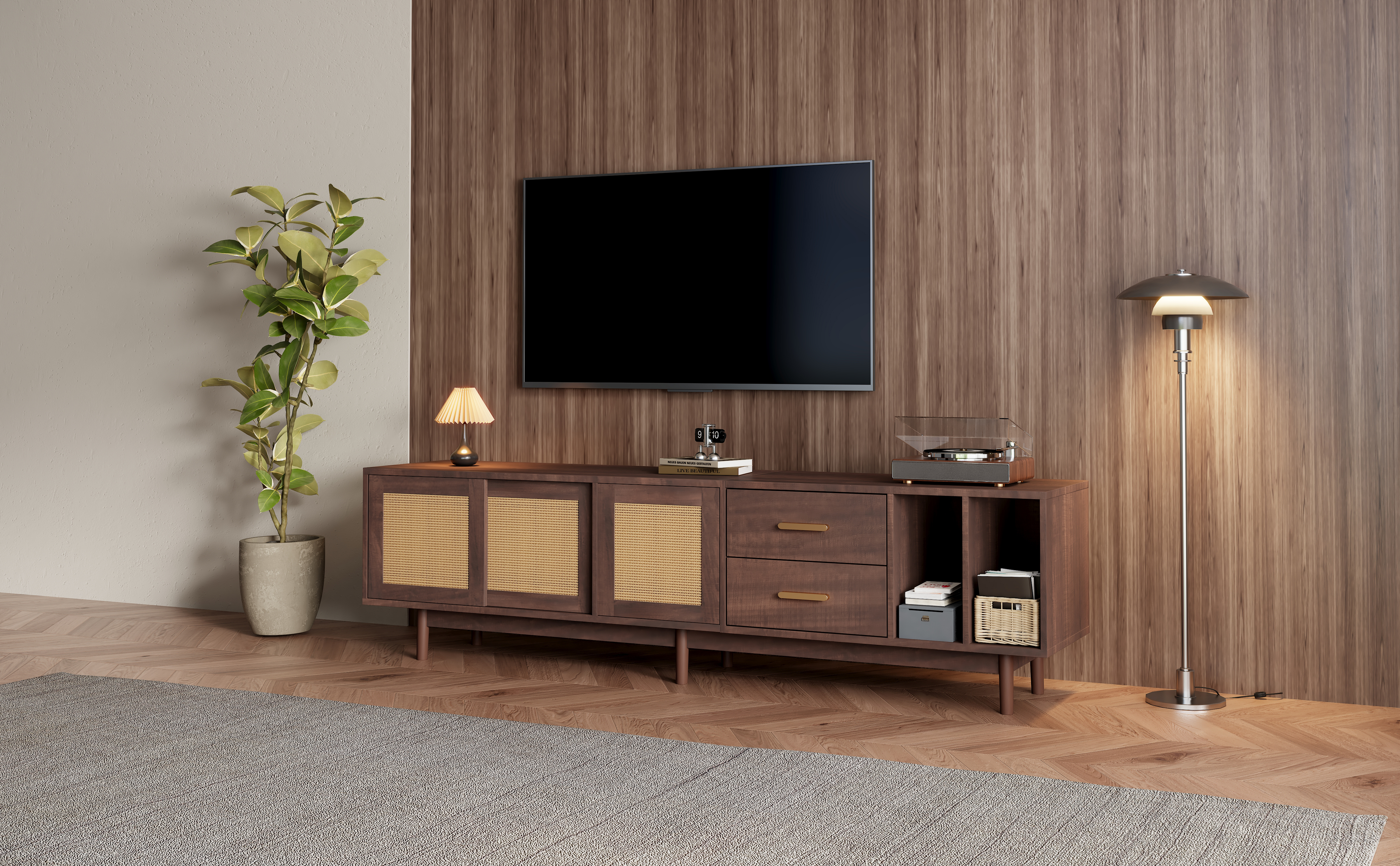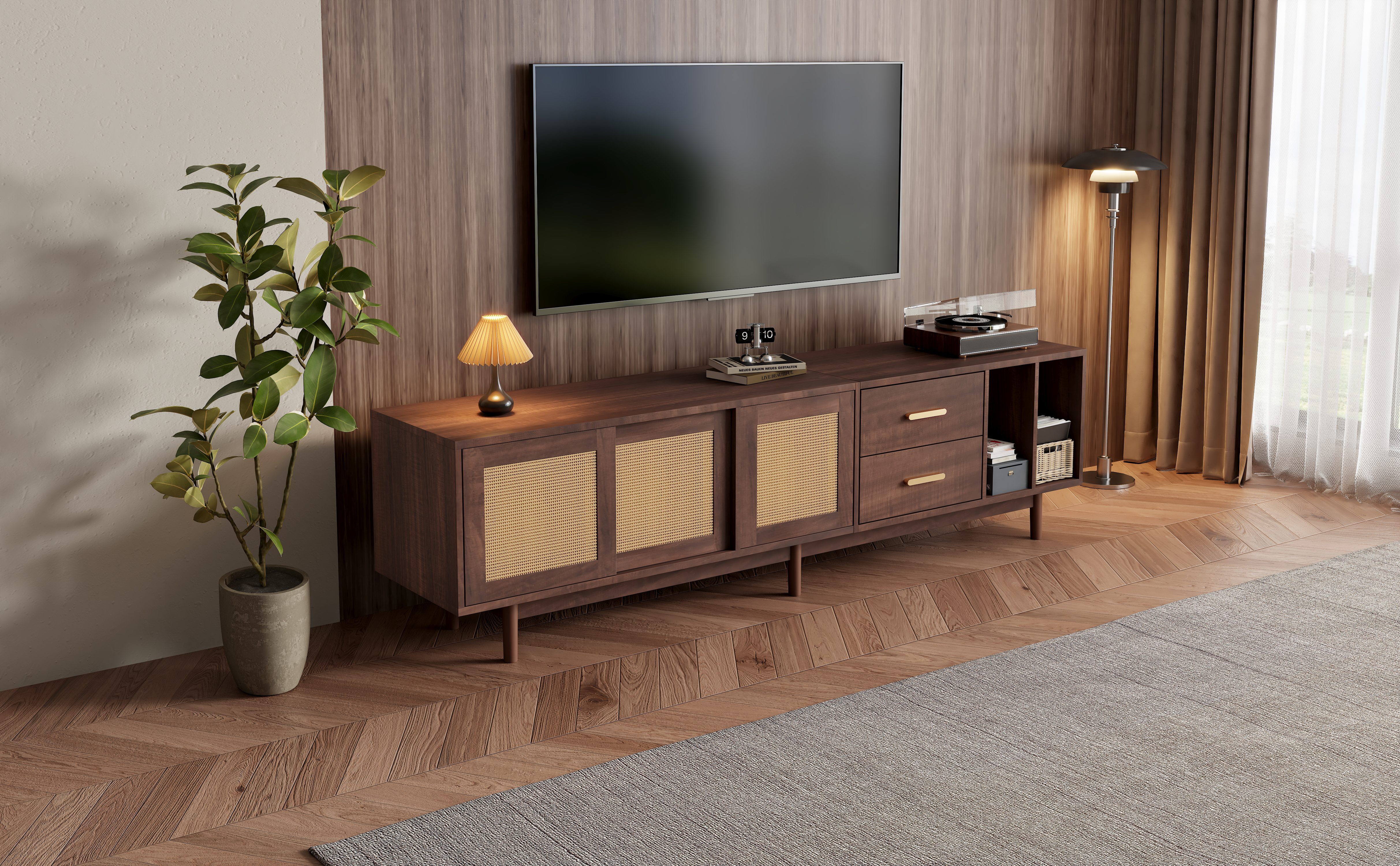 - The thoughtfully designed double-drawer + rattan sliding door storage structure provides clear and logical organization. The double drawers neatly store remote controls, game consoles, set-top boxes, audio-visual cables, and other small items, while the sliding door space can store books, decorative items, and audio-visual equipment, combining concealed storage with display functionality.
