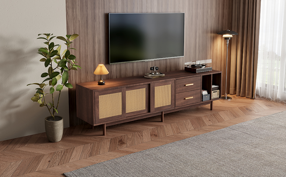 This dark wood TV cabinet features rattan sliding doors and a double drawer design, exuding a simple yet sophisticated and natural feel that complements various living room and bedroom décor styles. Made from high-quality MDF board, its sturdy and durable structure, measuring 190*40*52 cm, easily accommodates TVs up to 80 inches. The double drawers and rattan sliding doors offer well-organized storage compartments and ample storage capacity. The smooth-sliding, breathable, and moisture-proof sliding doors allow it to function as a TV control panel, entertainment center, or storage sideboard—practical and aesthetically pleasing.
