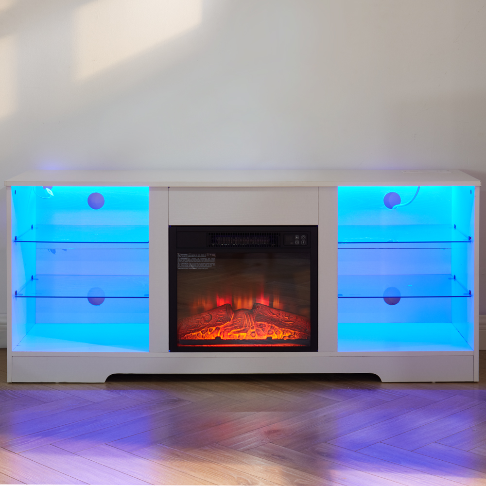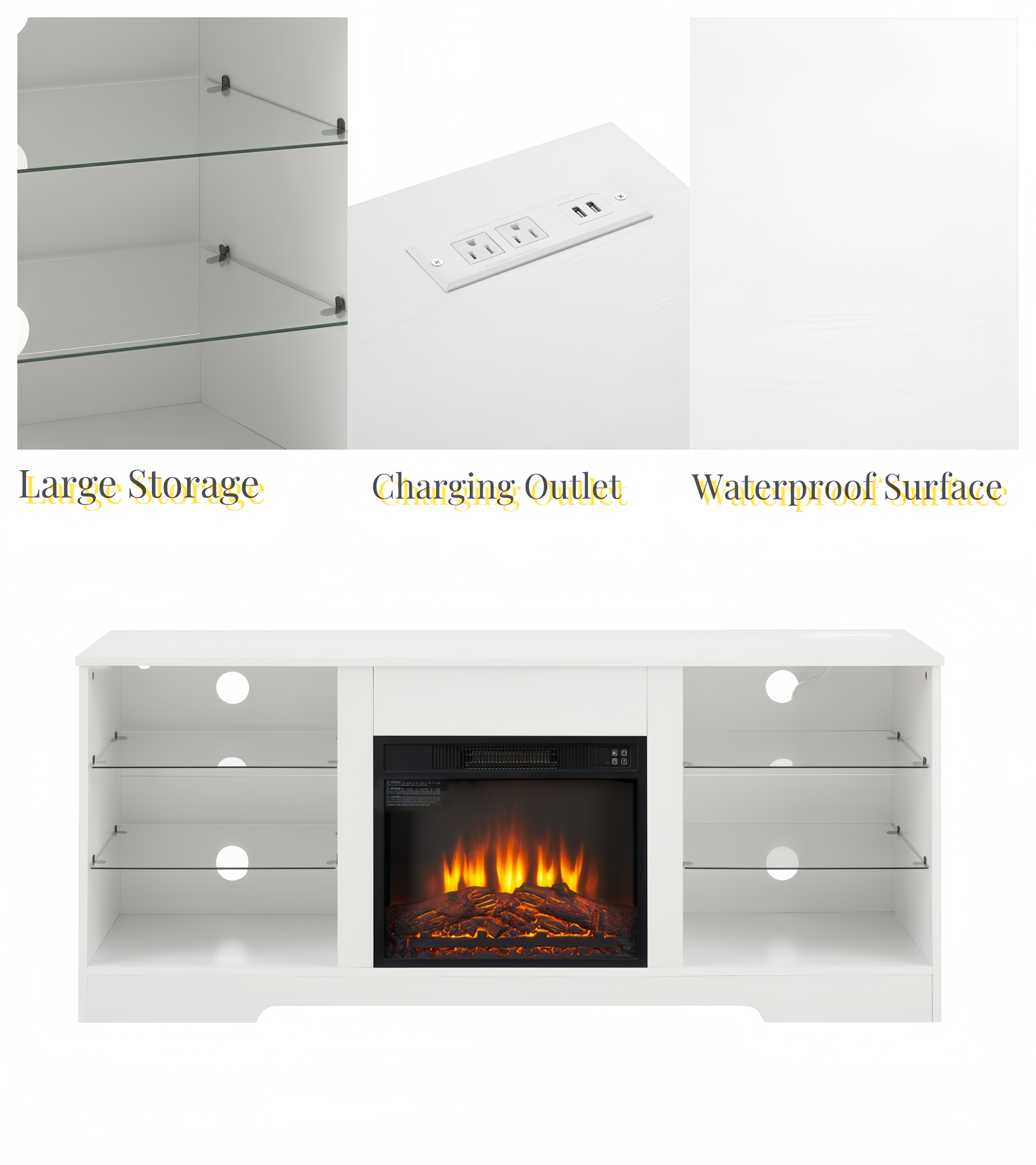 Product Name:TV Stand Electric Fireplace TV Stand with Glass Shelves, 3D Fireplace TV Stand with LED Lights Wood with USB Charging Outlet Modern Television Table Center for TV up to 32-62" White 58''W*15.4''D*24.4