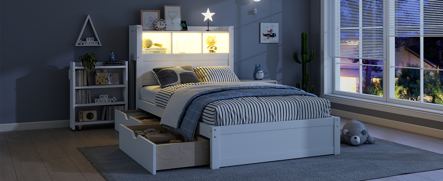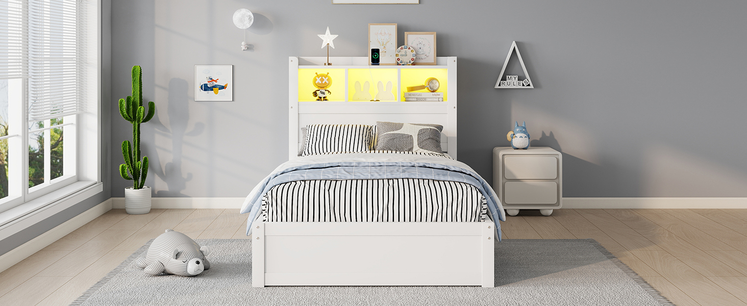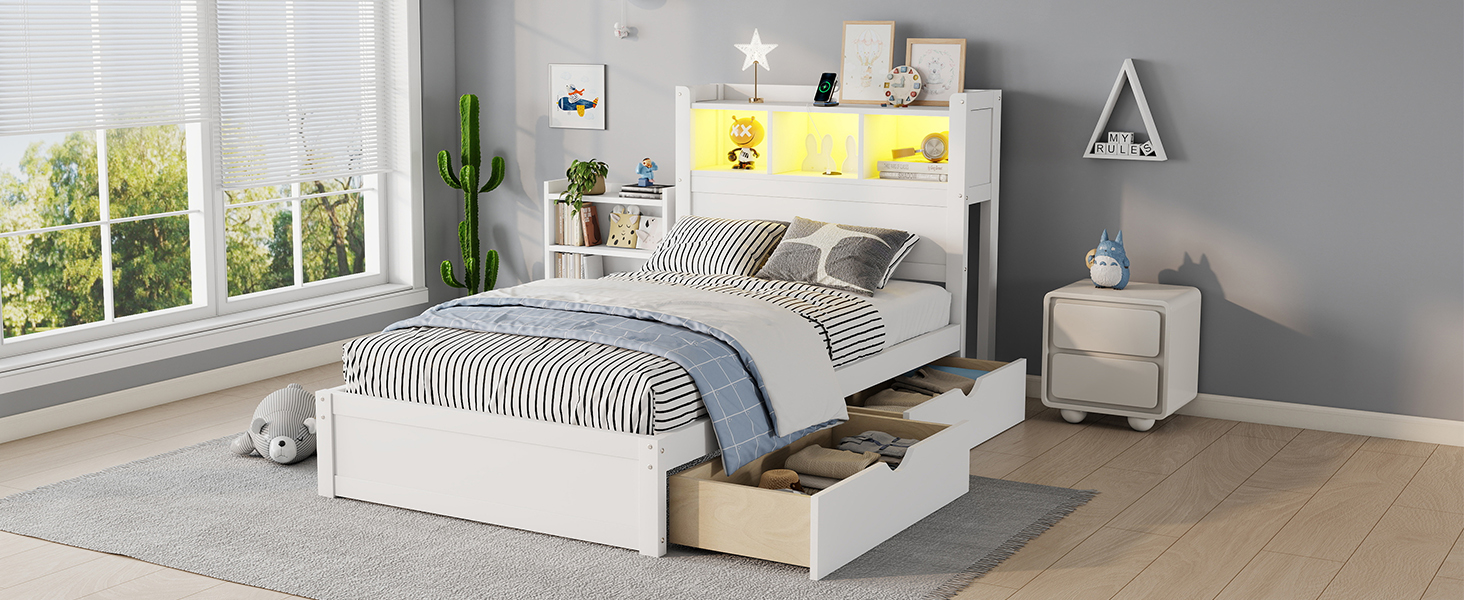 This wood twin bed included the storage shelves on headboard and LED light, also drawers and pull out storage cabinet which save space for your room.