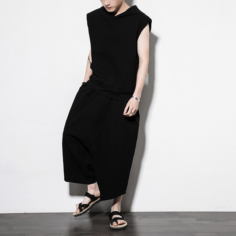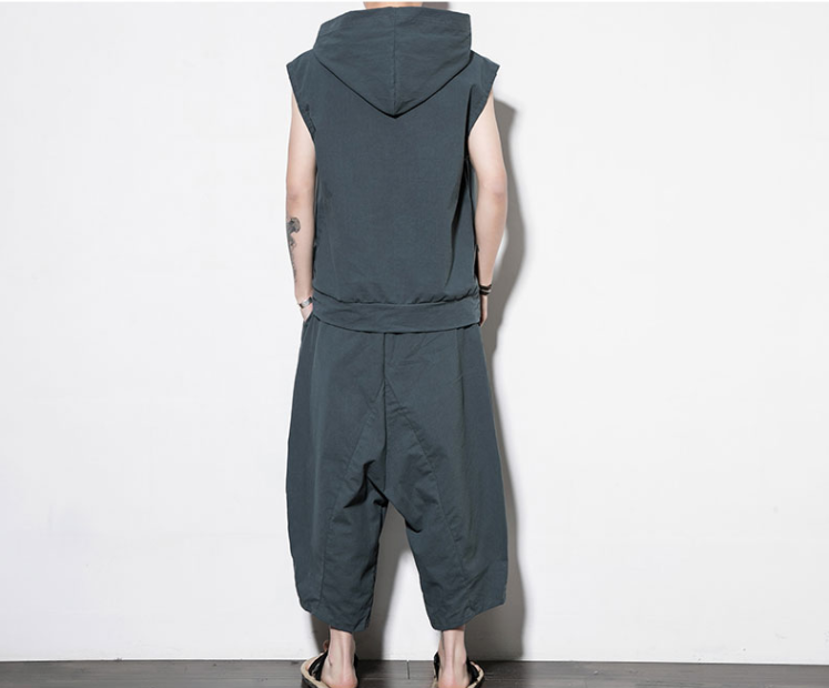 Two-piece Cotton And Linen Solid Color Hooded Vest And Bloomers