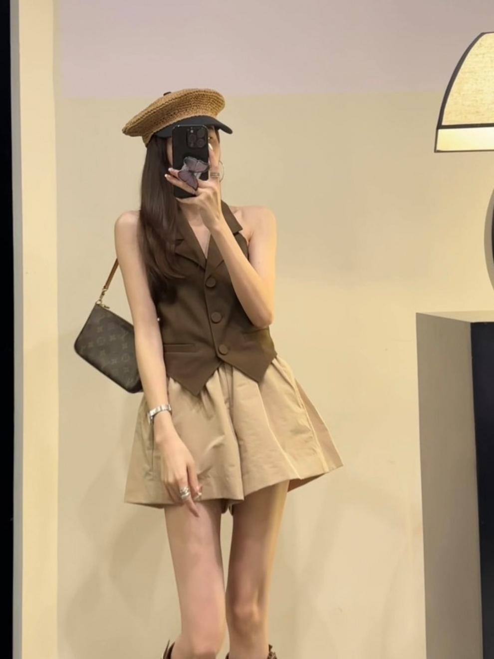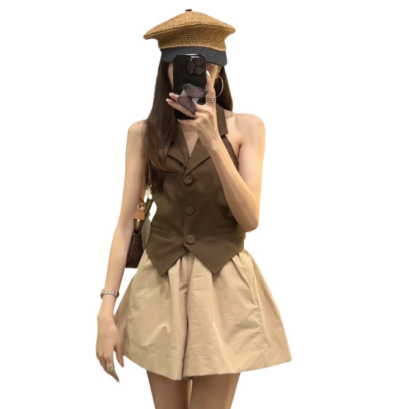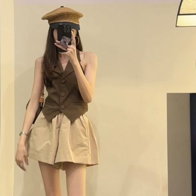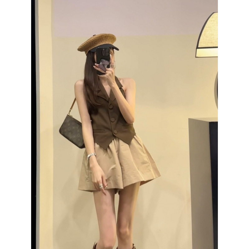 Color: Coffee-colored tank top, khaki shorts, coffee-colored tank top with khaki shorts