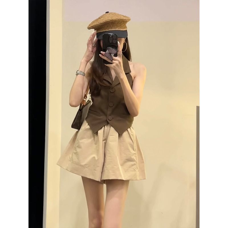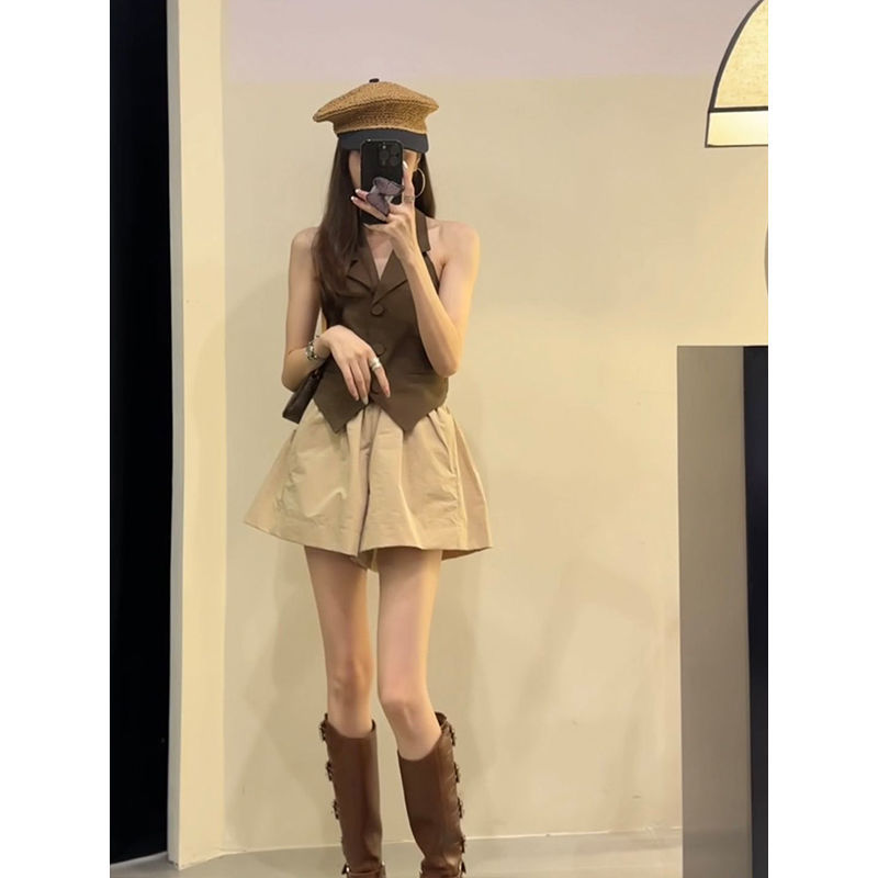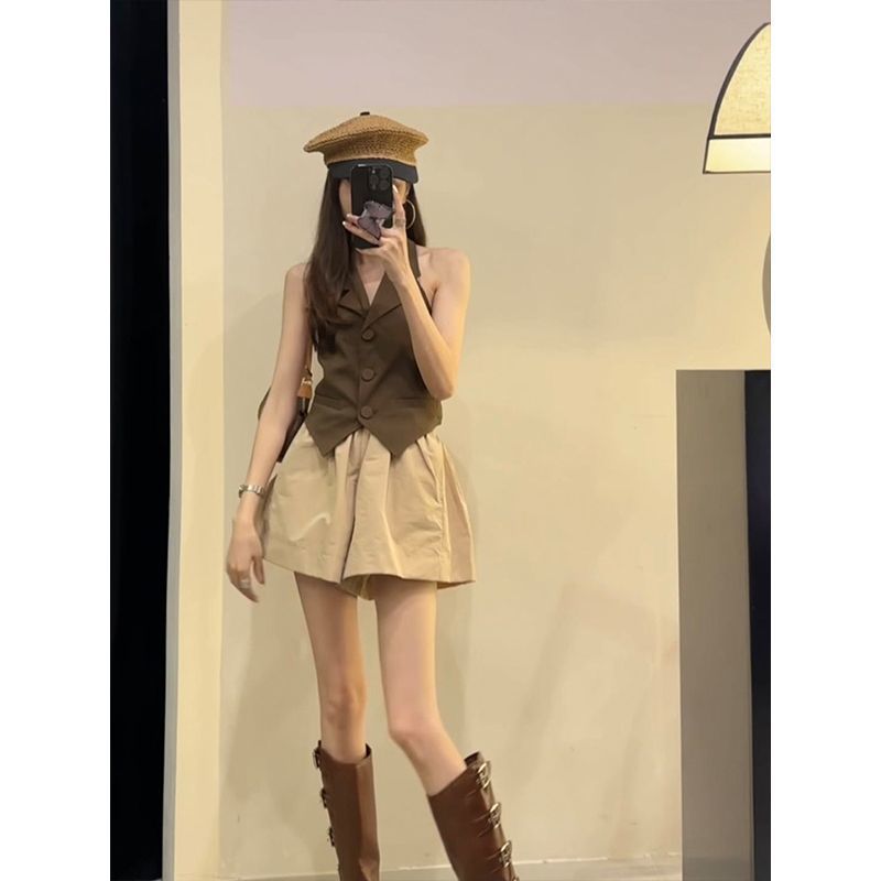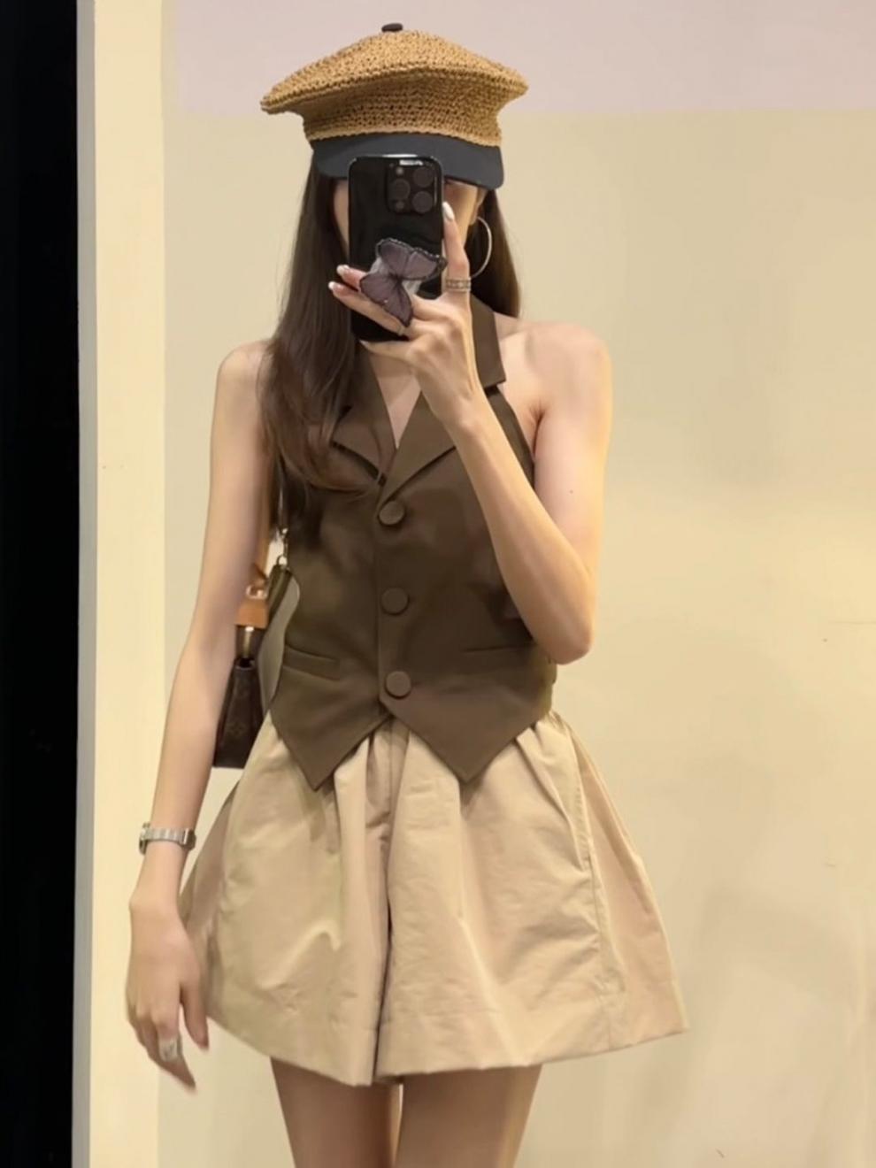 Color: Coffee-colored tank top, khaki shorts, coffee-colored tank top with khaki shorts