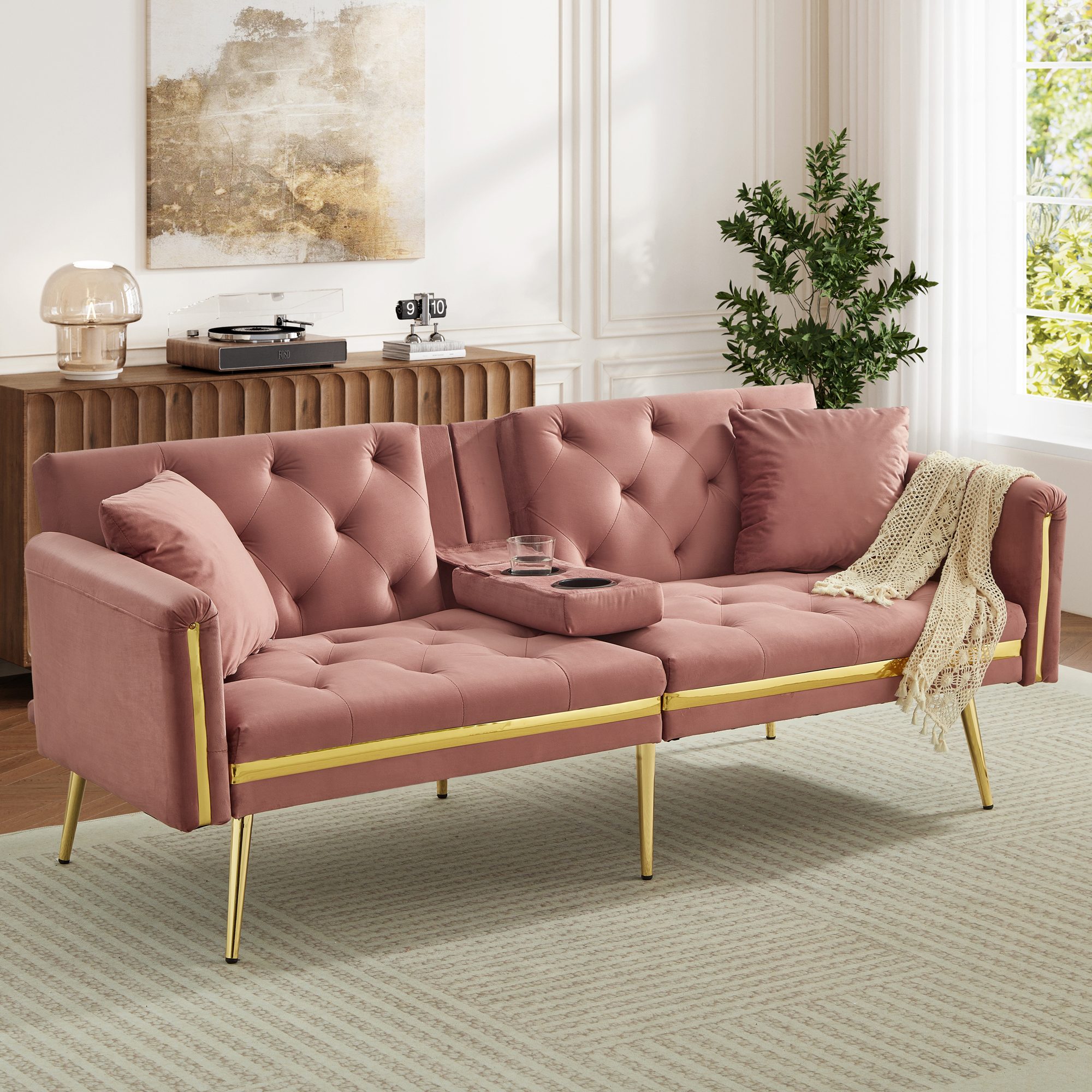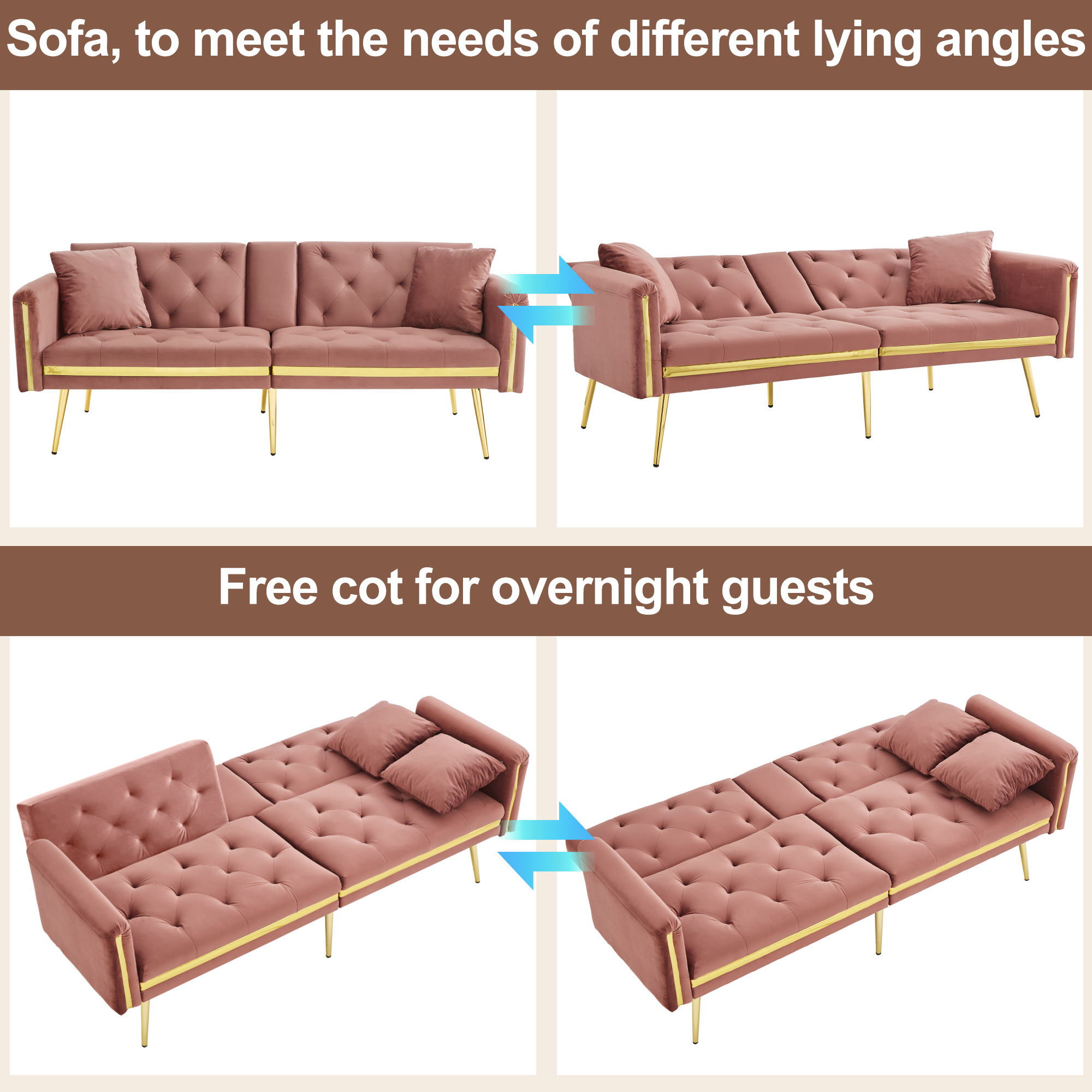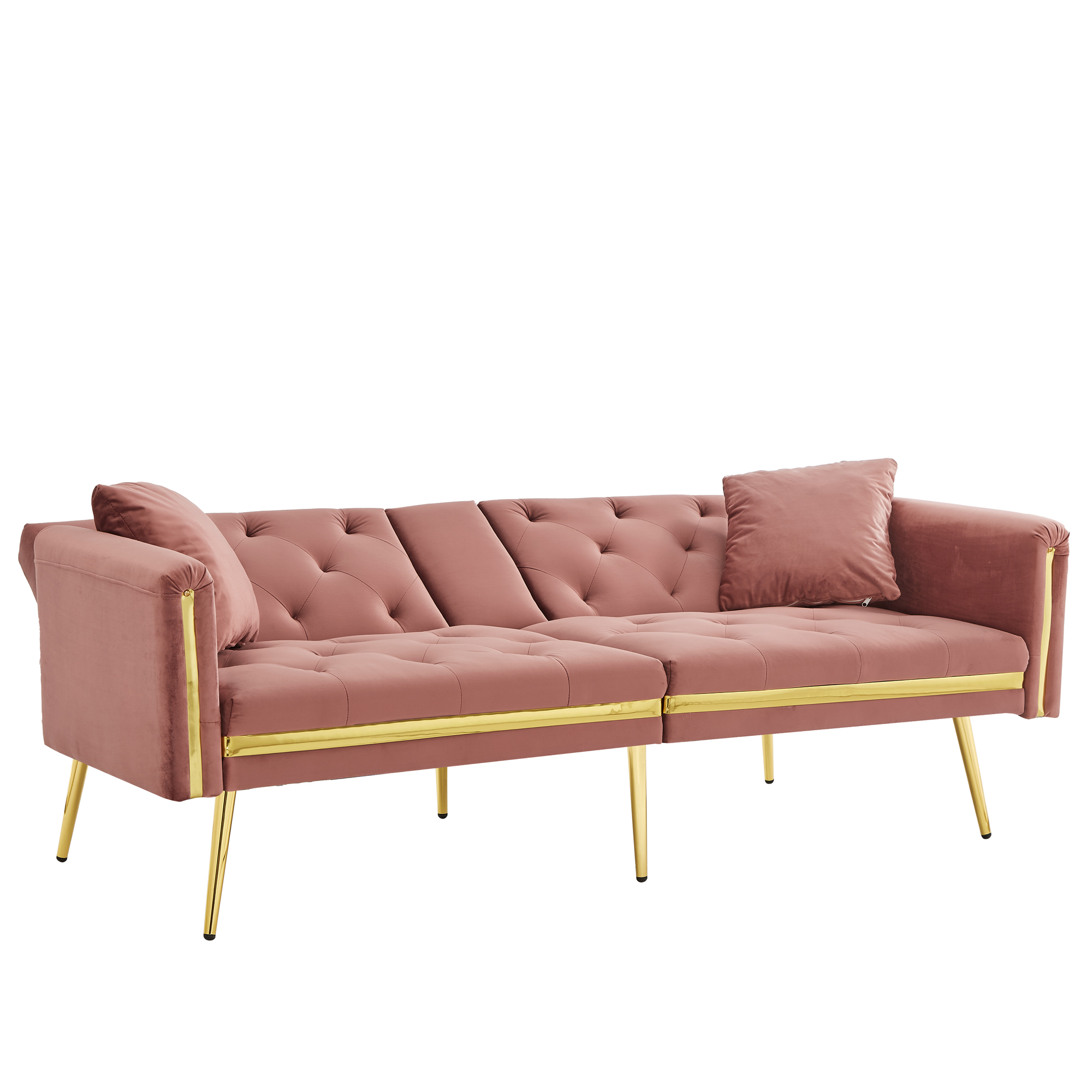 Product Name:Two-seater sofa bed with adjustable backrest, gold accents and built-in cup holders - convertible into a comfortable and space-saving two-seater sofa for both the living room and bedroom