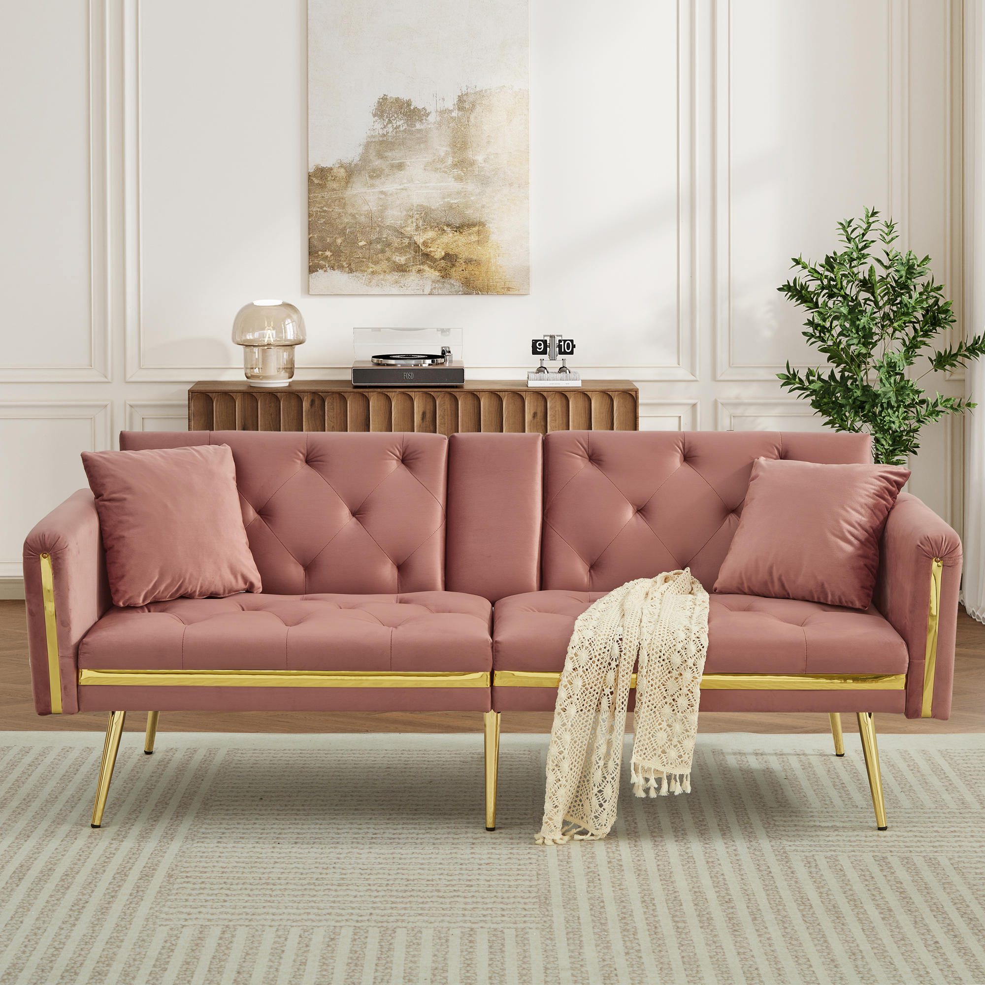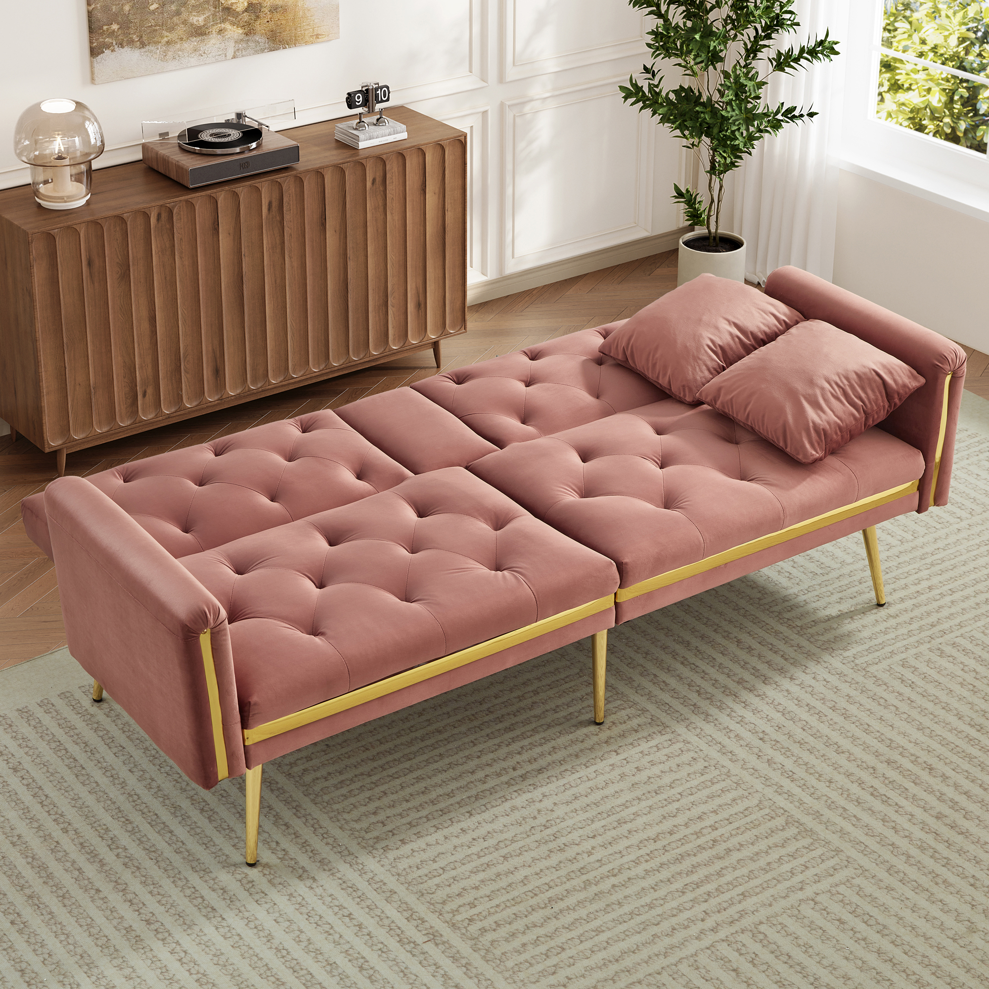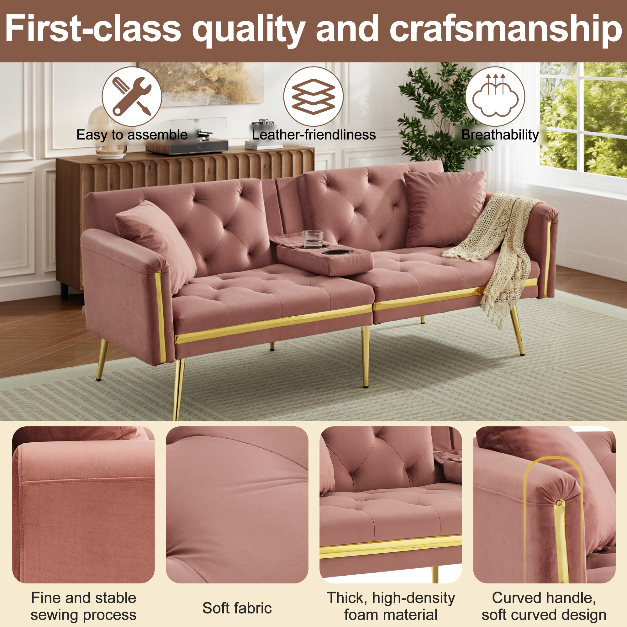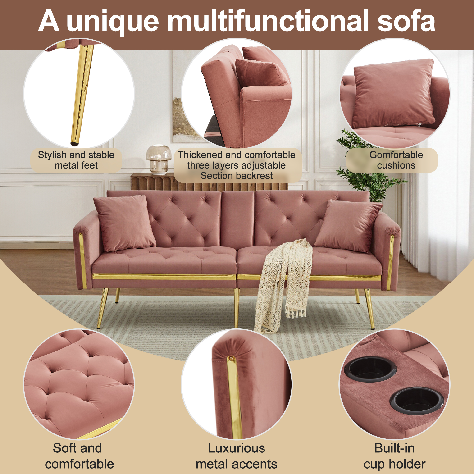 Product Name:Two-seater sofa bed with adjustable backrest, gold accents and built-in cup holders - convertible into a comfortable and space-saving two-seater sofa for both the living room and bedroom