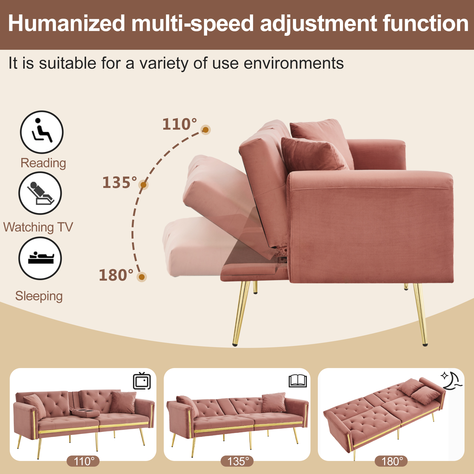This modern velvet sofa combines luxurious design, superior comfort, and smart functionality in one stylish piece that enhances any home. The soft velvet upholstery adds a touch of elegance to your space while offering a smooth, comfortable texture that feels inviting. With high-density foam padding, both seat and backrest deliver excellent support, ensuring lasting comfort whether you are sitting or lying down. Golden metal legs and elegant trim details bring a sophisticated, modern look to the sofa, making it not just functional but also a statement piece in your living room or bedroom. These eye-catching features add a luxurious flair to your décor while guaranteeing stability. The cleverly integrated, concealed cup holder allows you to easily enjoy your drink without the need for an additional side table. When not in use, the cup holders tuck away neatly, keeping the sofa’s sleek design intact. Another highlight is the 3-level adjustable backrest, which allows you to switch between different angles for maximum comfort: 110° for reading, 135° for watching TV, and 180° for a full recline that turns the sofa into a comfortable bed. This makes it ideal for overnight guests, naps, or versatile use in multi-purpose spaces. Thanks to its compact yet practical design, this sofa fits perfectly in small apartments, living rooms, bedrooms, or guest rooms. It maximizes functionality without sacrificing style or comfort, making it the perfect choice for anyone who values modern aesthetics combined with convenience.