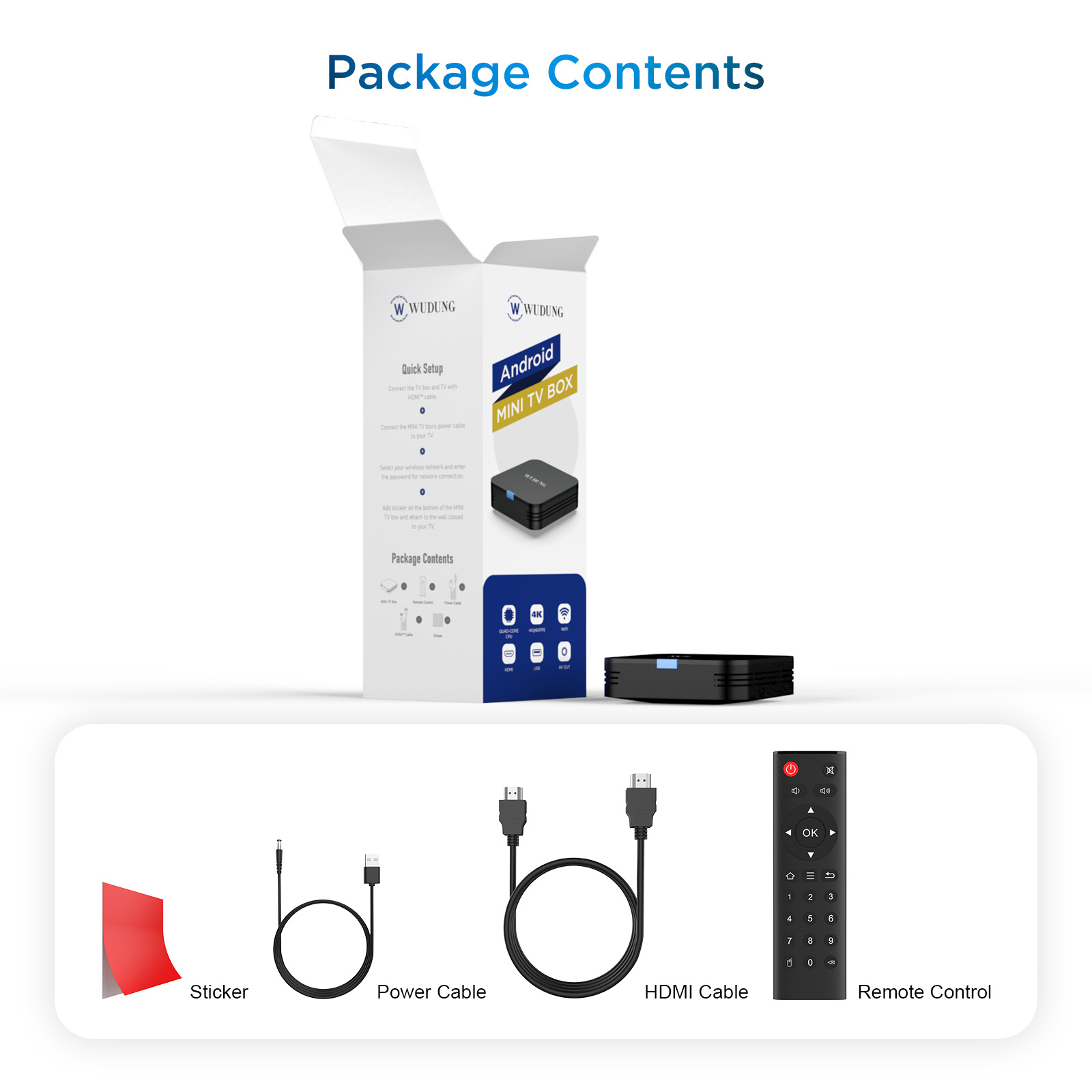 Package Contents: Remote control, HD cable, power supply, manual